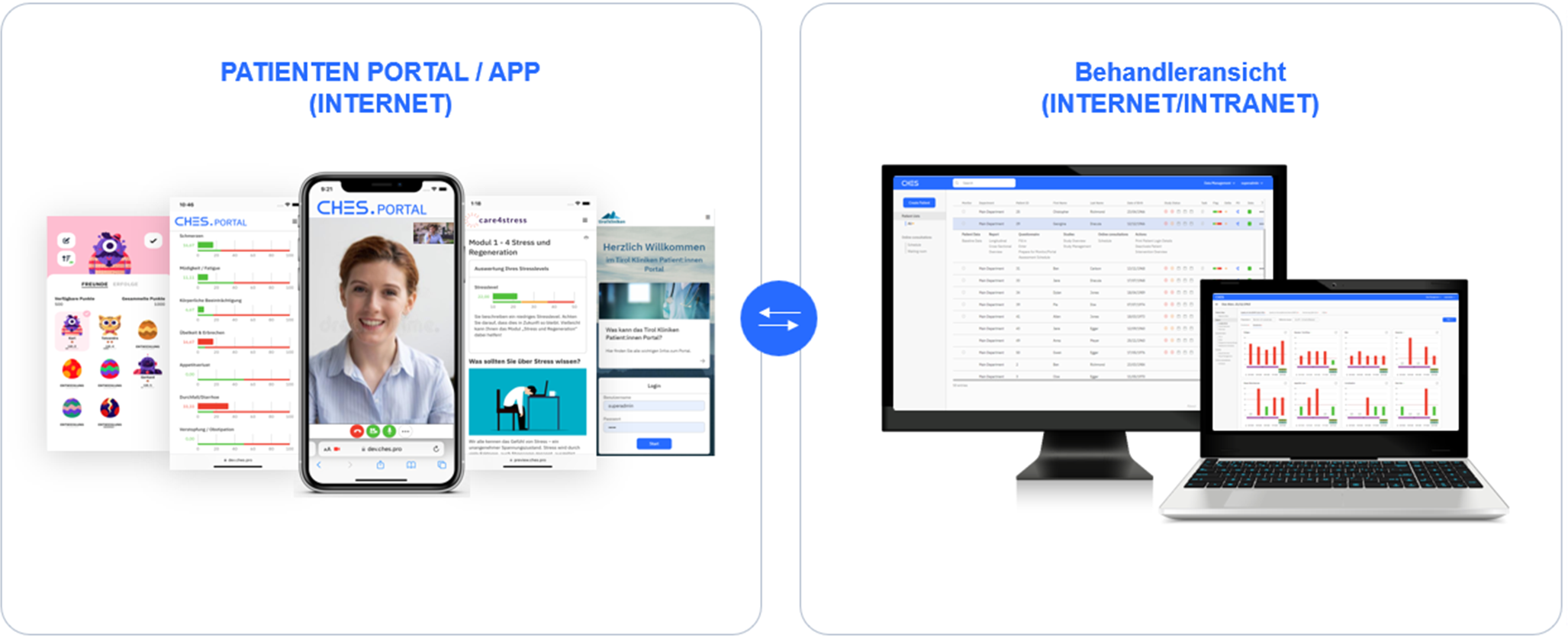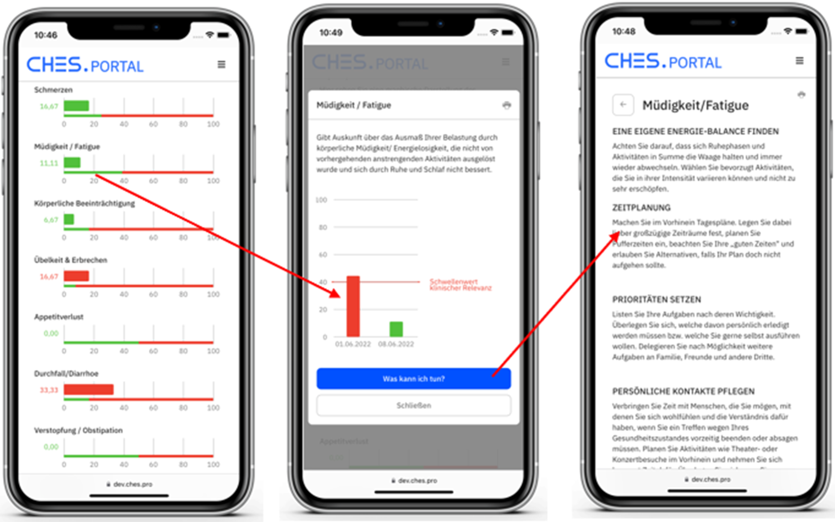 Als Software wird dabei auf CHES (Computer-based Health Evaluation System) zurückgegriffen, das von der Firma Evaluation Software Development (www.ches.pro) in Innsbruck entwickelt wurde (Abb. 1). Die Applikation bietet ein modulares Patientenportal mit verschiedensten Funktionen wie ePRO-Erhebung, Patientenselbstmanagement (Abb. 2), Informationsmaterial, Selbstanamnese, Videokonferenz, Befundupload. Die PRO-Daten werden sowohl in der Behandleransicht als auch in der Patientenapplikation (App) grafisch dargestellt (Abb. 3). Das Modul zur Generierung von Alerts ist als Medizinprodukt der Klasse 2a zertifiziert.