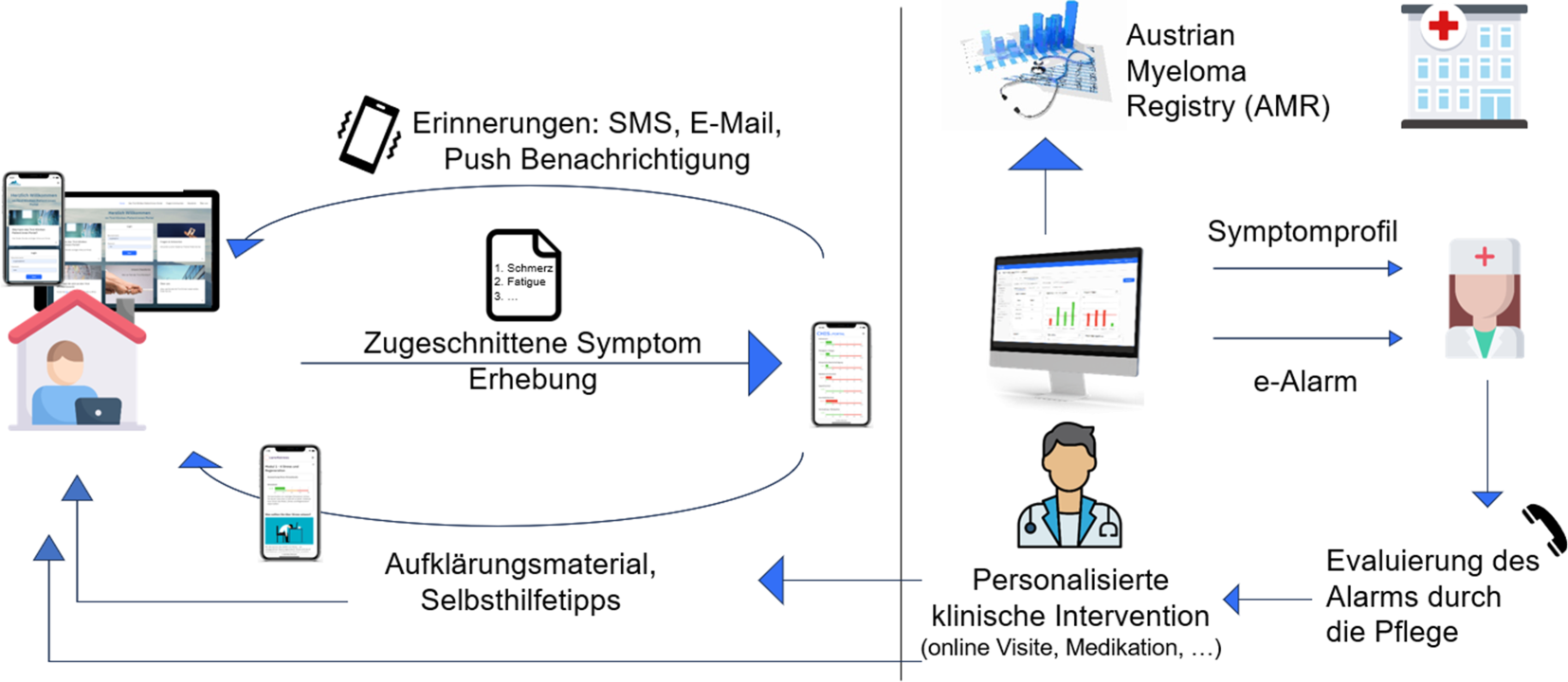 An der hämatologisch-onkologischen Ambulanz entwickelte sich die ePRO-Implementierung aus dem Austrian Myeloma Registry, in das bereits frühzeitig PROs integriert wurden. Erste PRO-Erhebungen erfolgten bereits 2013 im Rahmen der Registerforschung. Aufgrund der positiven Rückmeldungen und der als klinisch relevant eingeschätzten Informationen wurden PROs schrittweise auch in die ambulante Routineversorgung integriert [32]. Seither erfolgt bei teilnehmenden Patient:innen bei jedem Ambulanztermin eine standardisierte Erhebung des EORTC QLQ-C30 [1] sowie eines tumorspezifischen Moduls. Seit 2017 wurde das Konzept durch die Einführung eines Patientenportals weiterentwickelt, das sowohl zur ePRO-Erhebung als auch zur strukturierten Bereitstellung von Informationen und Unterstützung außerhalb der Klinik dient. Eine systematische Evaluation mit über 120 Patient:innen bestätigte die hohe Akzeptanz und empfand das Portal als sinnvolle Ergänzung zur Betreuung [14]. Seit dem Start der PRO-Erhebungen auf der Ambulanz (Stand Juli 2025) wurden 555 Patient:innen rekrutiert, welche im Mittel 18 Erhebungszeitpunkte haben.