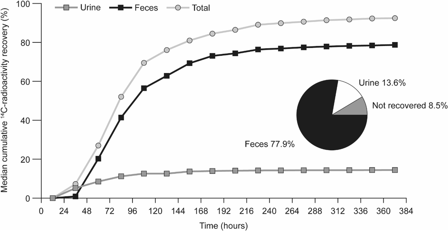 Median cumulative recovery of [14C]-radioactivity in urine and feces and combined (total). Pie chart shows respective geometric mean values