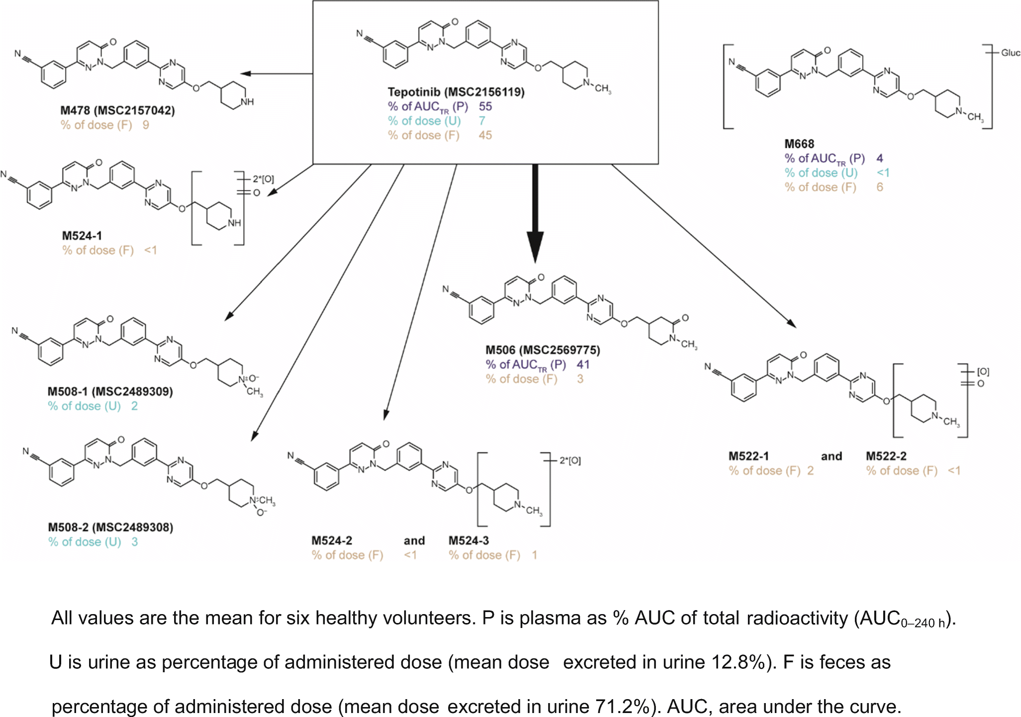 This was an open-label, single-center, phase I study in two parts, designed to investigate the mass balance, metabolism, and absolute bioavailability of tepotinib in two groups of six healthy male volunteers (EudraCT 2013-003226-86). Part A of the study was designed to evaluate the mass balance of tepotinib, identify major routes of elimination, determine the unbound fraction of tepotinib in plasma and its blood/plasma distribution, and identify and quantify metabolites of tepotinib in plasma, urine, and feces. Part B was designed to determine the absolute bioavailability of the phase II tablet formulation of tepotinib.