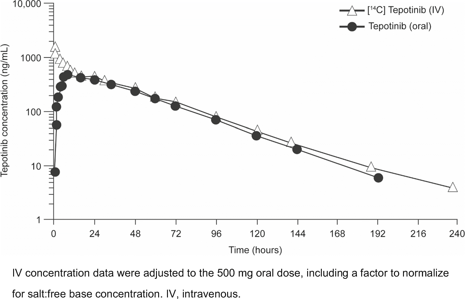 The purpose of the present study (EudraCT 2013-003226-86) was the characterization of the pharmacokinetics (PK), drug disposition, and metabolism of tepotinib in healthy volunteers. In part A of the study, [14C]-tepotinib was administered orally to evaluate the absorption, distribution, metabolism, and excretion of tepotinib. The availability of [14C]-labeled tepotinib, in conjunction with recent advances in the clinical use of microtracer doses and ultrasensitive bioanalytical methods [23], allowed the evaluation of the PK of tepotinib after intravenous (IV) dosing and its absolute bioavailability in part B of this study. For orally administered drugs such as tepotinib, characterization of the PK profile following IV dosing is of highest value for correct interpretation of distribution and elimination [24]. The combination of both investigations (mass balance and absolute bioavailability) in this study represented an opportunity to obtain a comprehensive understanding of the PK of tepotinib, supporting the ongoing formulation development and its phase II program.