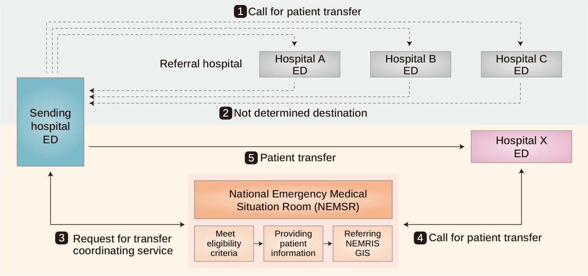 Korea has been operating a national coordinating service for interhospital transfer from EDs since 2014 to assist EDs having difficulties in selecting and arranging referral hospitals [6]. When it is decided that an emergency patient needs to be transferred to another hospital for advanced treatment, the staff or coordinators of the ED try to arrange the transfer. However, if the destination cannot be determined despite several attempts to arrange the transfer, the ED can seek assistance from the National Emergency Medical Situation Room (NEMSR) in Korea. Utilizing a protocolized process, communication by a public coordinator, and the electronic resource availability system, the NEMSR has arranged many interhospital transfers and determined referral hospitals for the sending EDs.