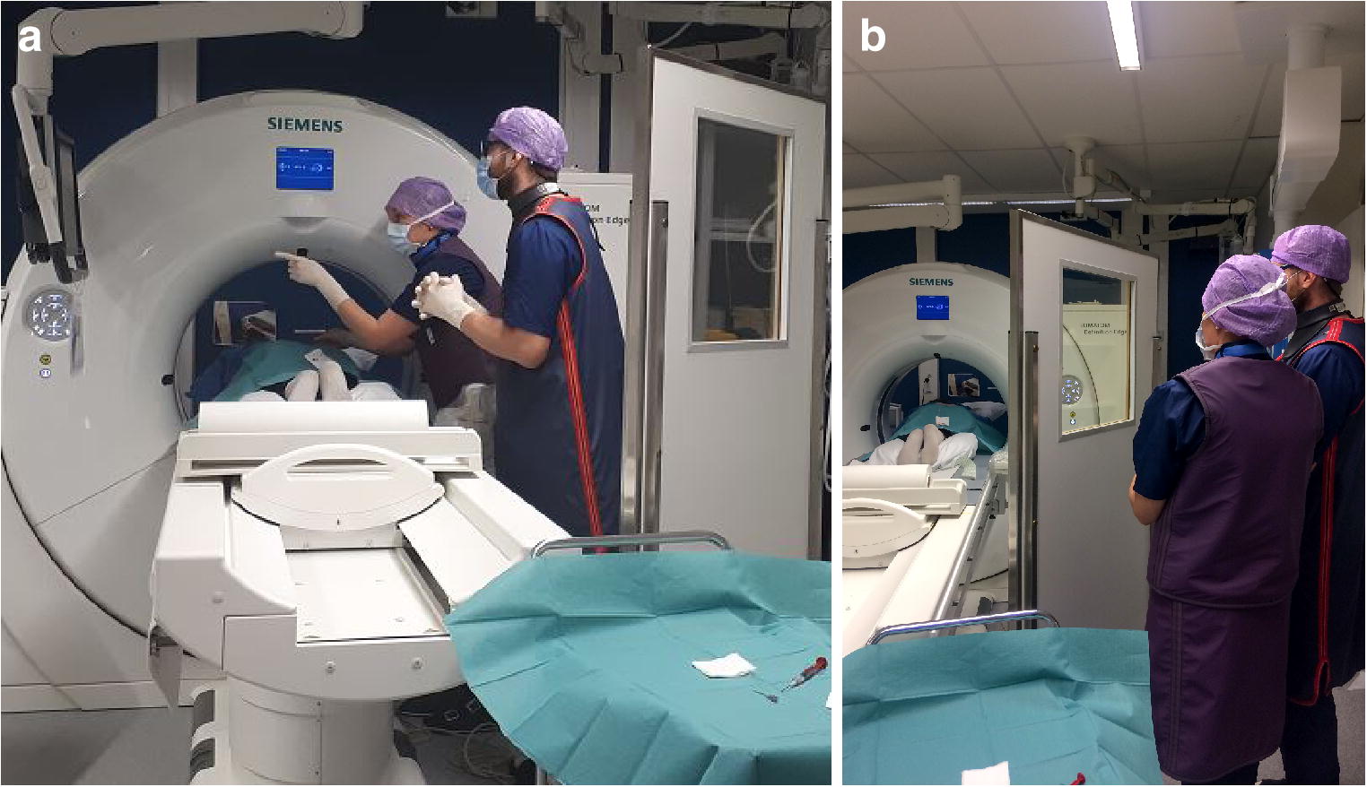 A typical positioning of the operators during a CT guided operation where (a) the operator needed to hold the instruments and stay approximately 30–50 cm from the fluoroscopy area and (b) the operators were able to stand behind the lead wall during fluoroscopy without having to constantly hold the instruments. The operator is on the left and the assisting operator on the right. In this particular procedure, the operator is not wearing lead glasses, the assistant operator is