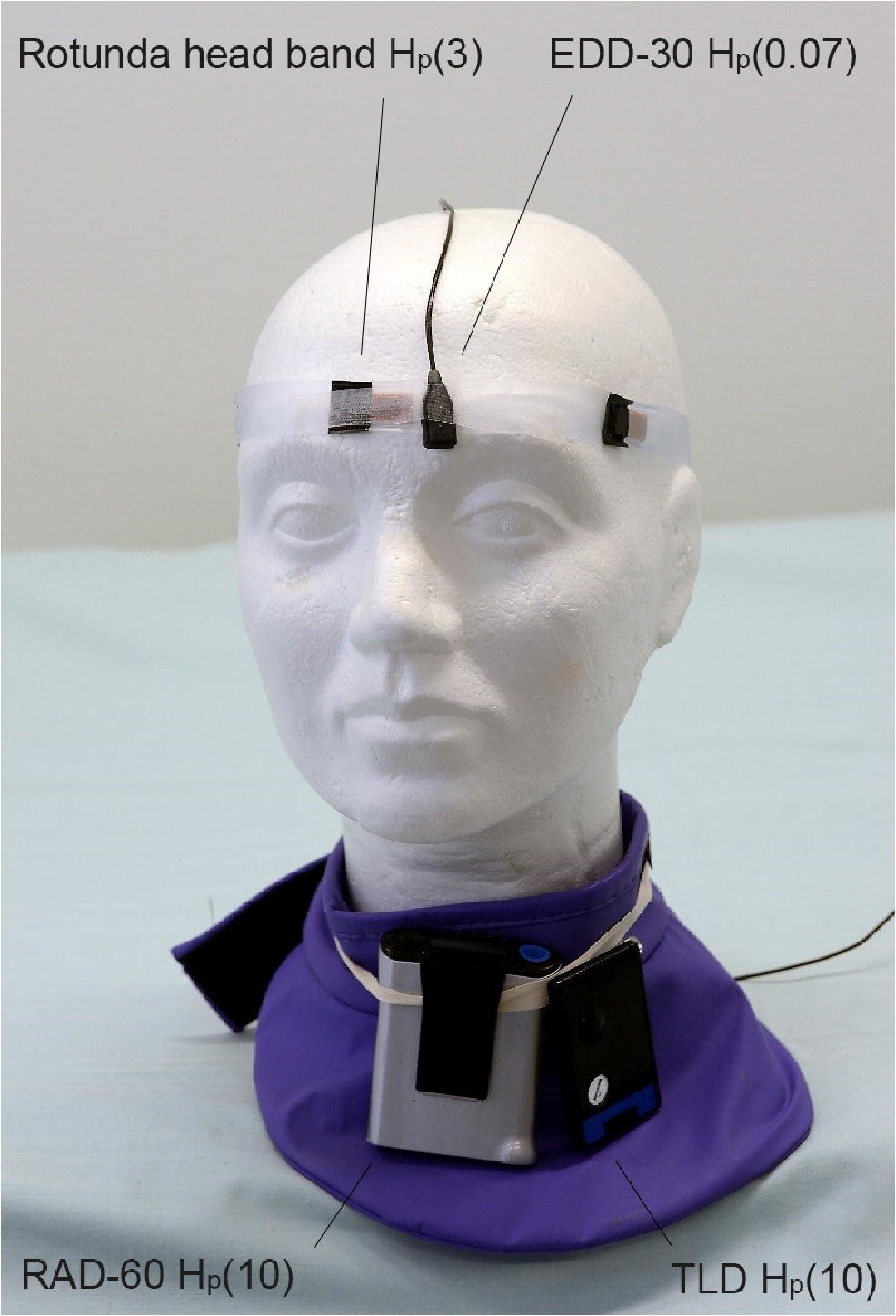 The eye lens doses were measured using a prototype of an eye dosimetry headband using a Harshaw ExtradTM dosimeter element which was calibrated for Hp(3) measurements (Rotunda Scientific Technologies). Furthermore, as there was no certified method for eye lens dose measurements Hp(3), routine dosimeters (measuring Hp(0.07) and Hp(10)) were also used in order to study the relationship between the doses measured with routinely used dosimeters and the eye lens dosimeter.