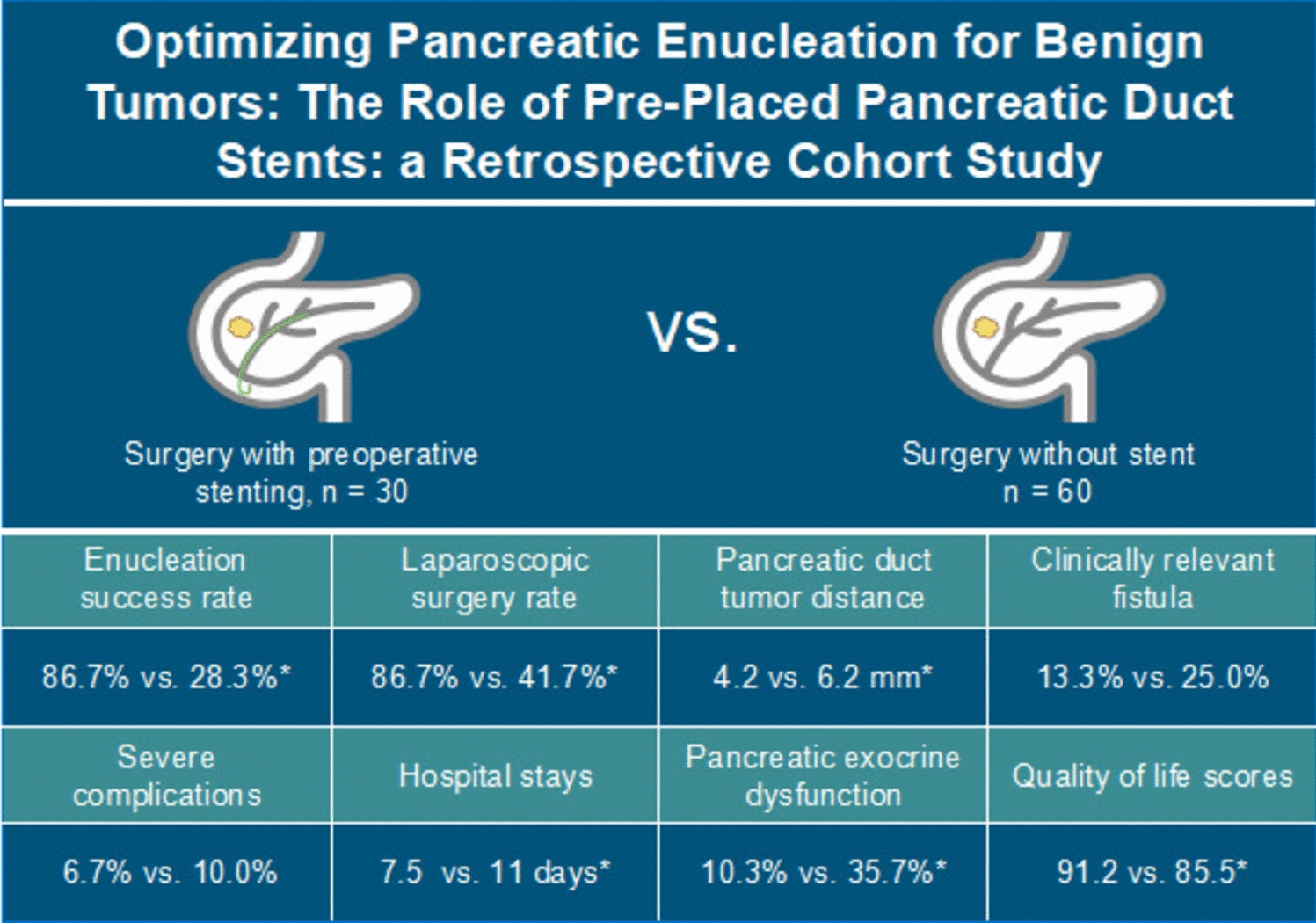 To investigate the effectiveness of pre-placed pancreatic duct stents on improving outcomes of pancreatic enucleation for benign tumors, a procedure often discouraged by postoperative complications, such as pancreatic fistulae.