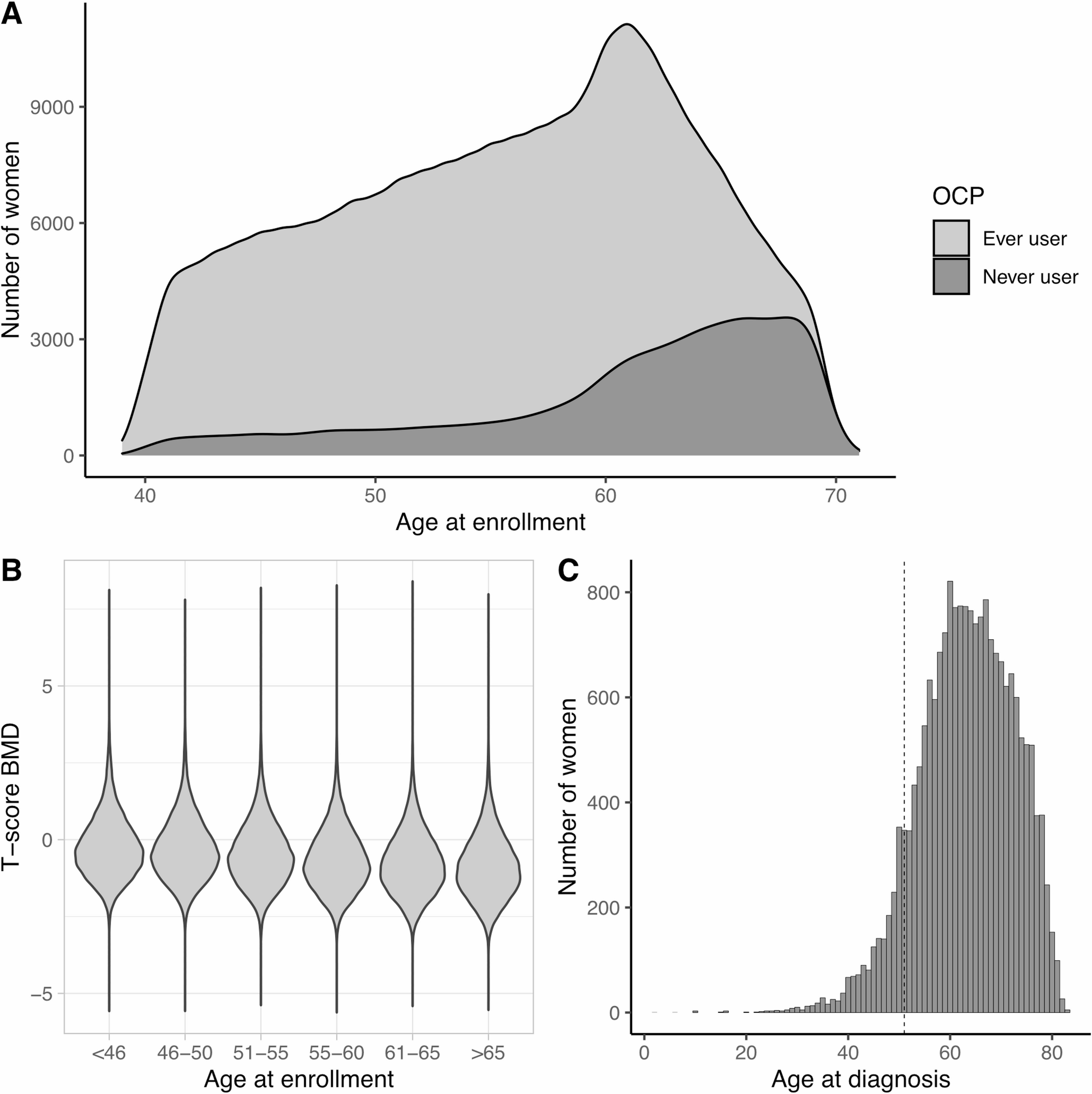 Age, BMD T-scores and osteoporosis diagnoses in UKB cohort. A Age at recruitment (initial assessment when BMD was measured) in UKB for women reporting that they had ever used or had never used OCP. B BMD T-scores from ultrasound measurement of the heel by age groups, with measurements taken at enrollment. C Number of osteoporosis cases by age at diagnosis. The dashed line represents the average age at menopause in UK women