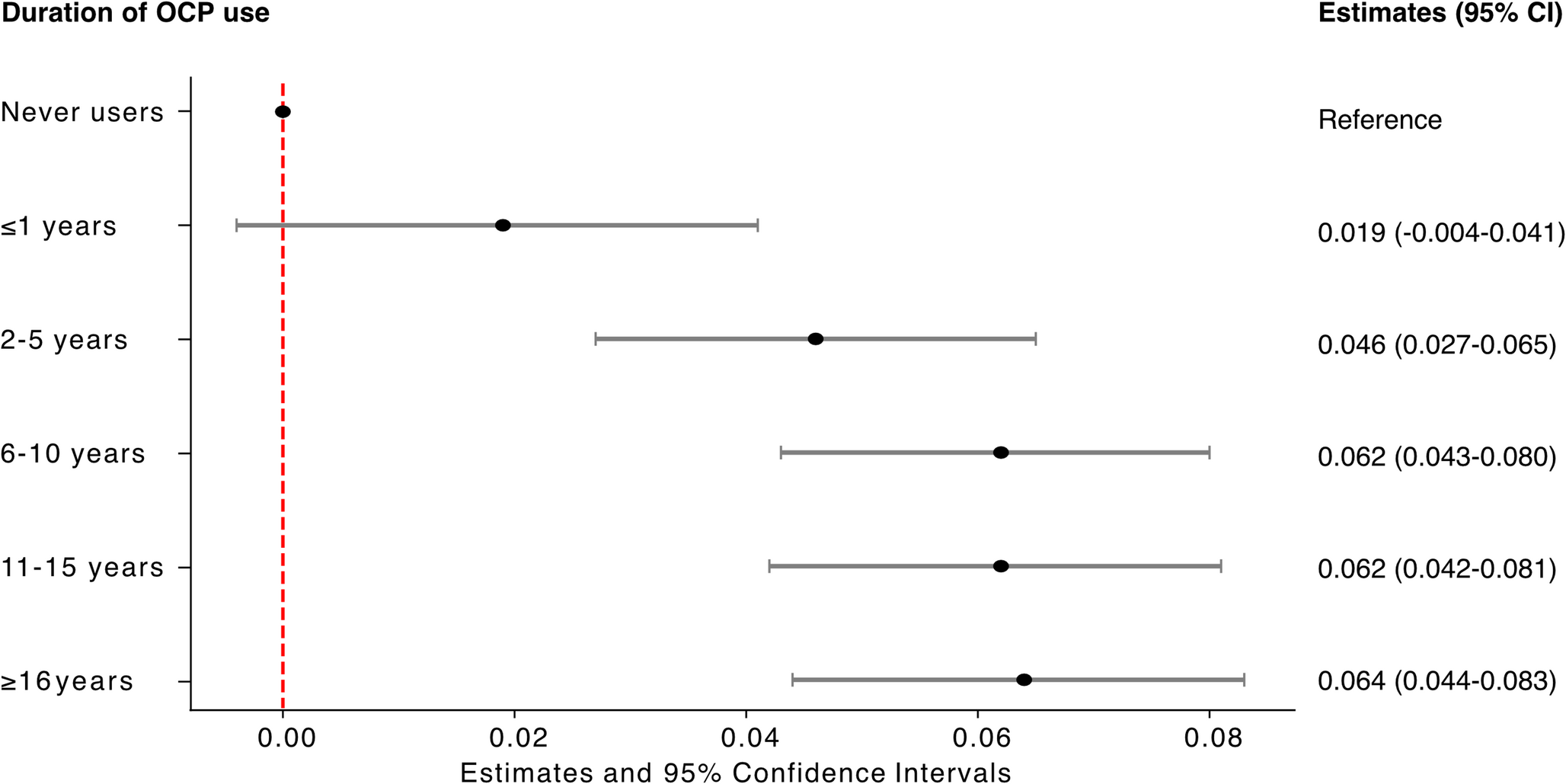 Estimates and 95% confidence intervals (CI) for duration of OCP use on average BMD T-scores. Users were stratified based on the duration of use: 1 year or less, 2–5 years, 6–10 years, 11–15, 16 years or more, and compared to never users as reference