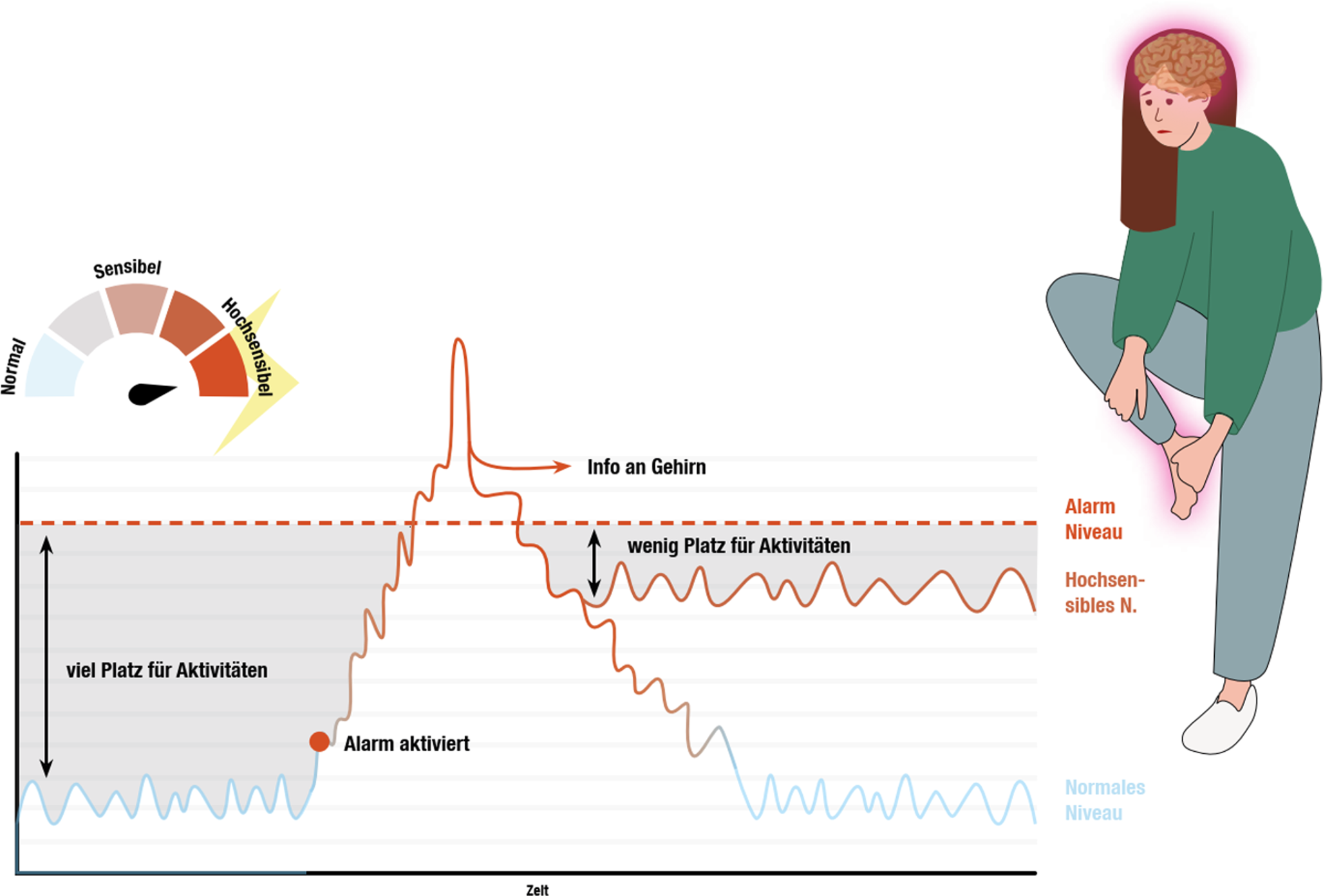Chronische Schmerzen sind häufig Ausdruck einer sogenannten zentralen Sensitivierung. Dabei handelt es sich um eine neuroplastische Übererregbarkeit des zentralen Nervensystems, bei der bereits harmlose Reize als schmerzhaft wahrgenommen werden (Allodynie) oder Schmerzreize übersteigert empfunden werden (Hyperalgesie).
