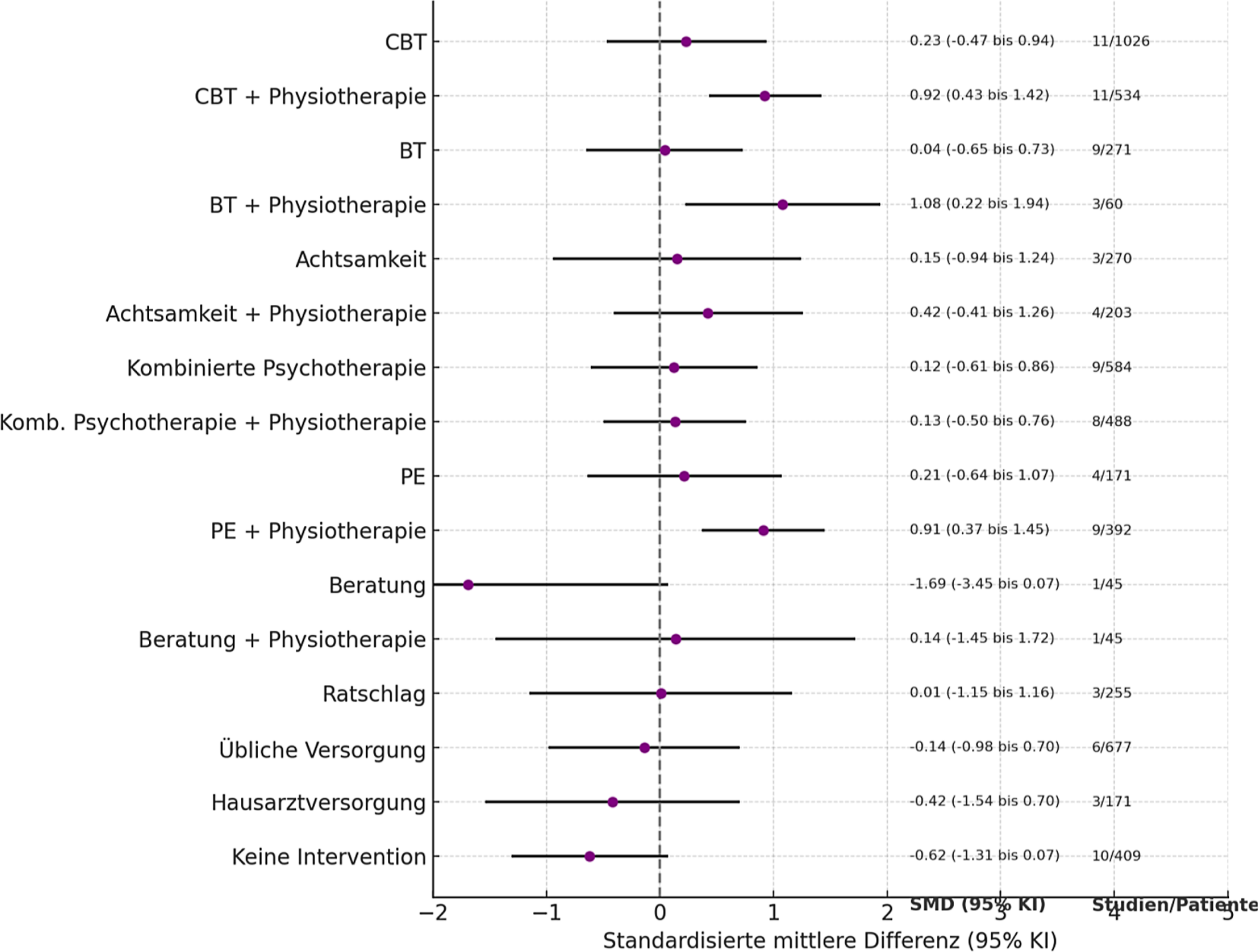 Forest-Plot der Netzwerk-Metaanalyse-Ergebnisse zur Schmerzintensität nach der Intervention modifiziert aus [14]. BT Verhaltenstherapie, CBT Kognitive Verhaltenstherapie, PE Schmerzerziehung (PNE), SMD standardisierte mittlere Differenz. Physiotherapieversorgung war die Referenzgruppe