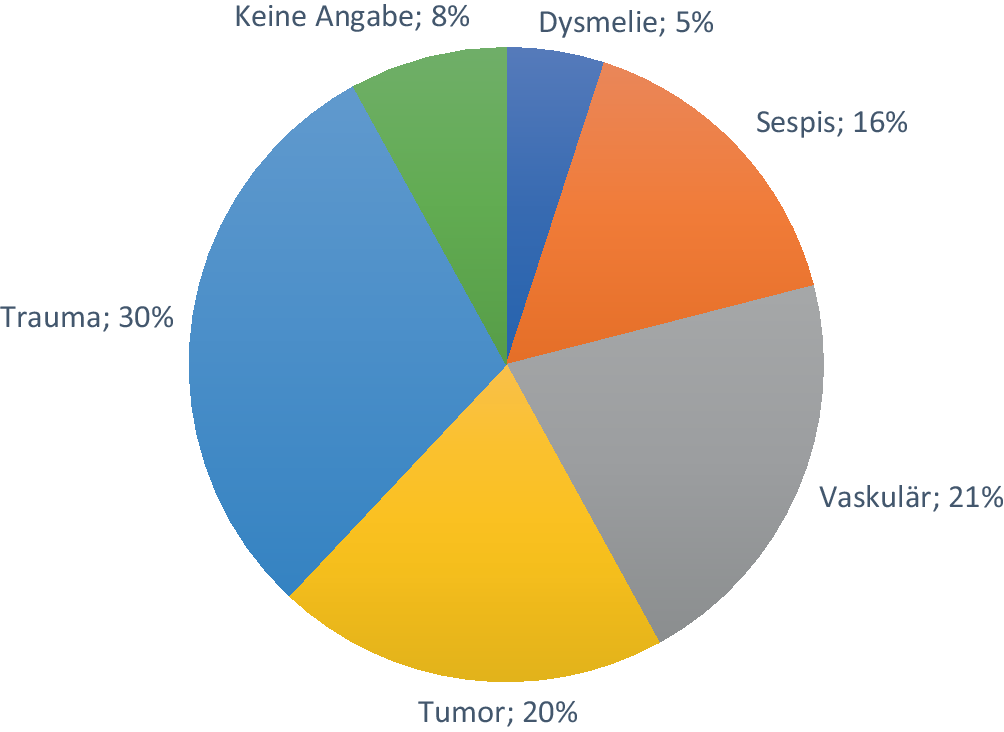 In der ersten Auswertung wurden diverse Parameter näher betrachtet bzw. ausgewertet. So wurde überprüft, welche Ursachen für die Amputation bei den erfassten 498 Personen vorlagen. In Abb. 2 ist die prozentuale Verteilung der Amputationsursache dargestellt. Die Gesamtheit der genannten Ursachen waren Dysmelie, Sepsis, Tumor, vaskuläre Gründe oder ein Trauma, wobei von 8 % der 498 Personen keine Angabe gemacht wurde. Die Hauptamputationsursachen sind mit 30 % v. a. traumatische Ereignisse, gefolgt von Tumorerkrankungen (20 %), was sich auch in der Sprechstunde der Klinik als offenbarer Standortfaktor widerspiegelt (Abb. 2).