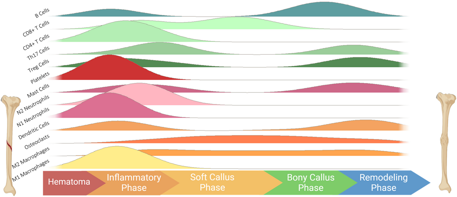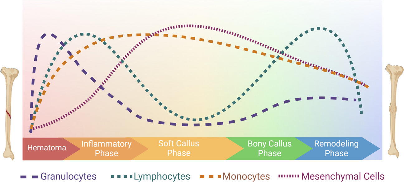 • Molitoris KH, Balu AR, Huang M, Baht GS. The impact of age and sex on the inflammatory response during bone fracture healing. JBMR Plus. 2024;8(5):ziae023. This is a recent study investigating age- and sex-dependent changes in immune cell response and in cytokine response prior to and during bone fracture healing. The work broadly observed the abundance of immune cell populations and cytokines both locally (within the fracture callus) and systemically (within the circulation/blood).