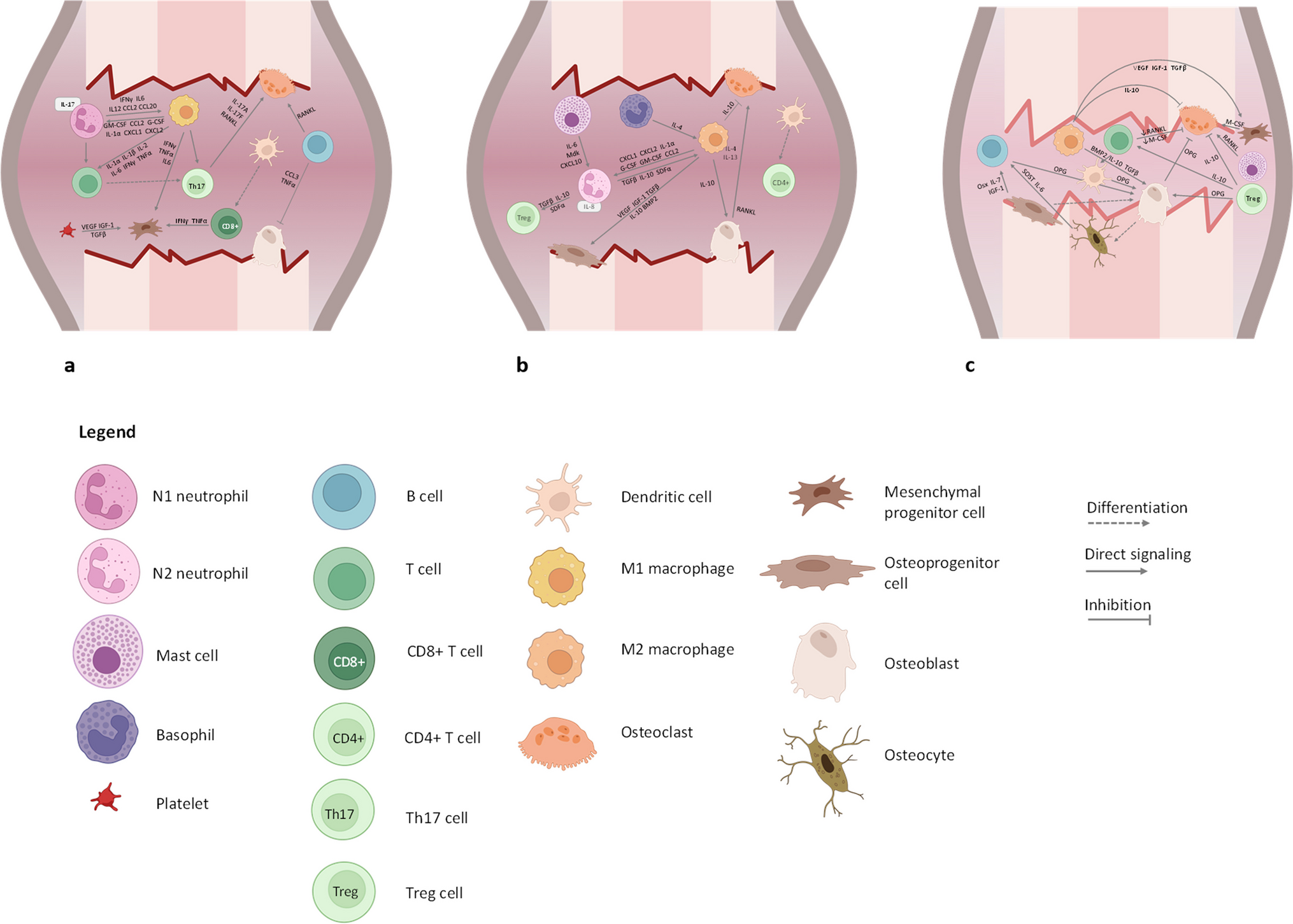 a Immune response during hematoma formation at the fracture site. b Immune response during the inflammatory phase at the fracture site. c Immune response in the soft and bony callus formation and remodeling phases of the fracture