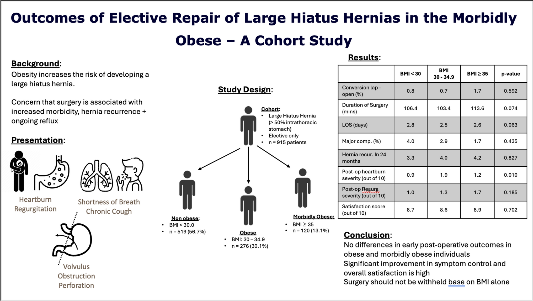 Prior to our study, Han et al. published the largest study to assess the impact of BMI on large hiatal hernia repair. Of the 884 patients included, 725 (86.3%) had an intrathoracic stomach of 50% or more and 45 patients (5.1%) underwent an emergency procedure. They demonstrated similar findings that increasing BMI was not associated with increased perioperative blood loss, length of stay, major complications, 90-day mortality, or early recurrence. However, their study had several limitations. The cohort was split across six categories based on BMI (underweight, normal weight, pre-obesity, and obesity class 1, 2, and 3) for comparison. Obesity class II had 76 (8.6%) patients and class III had just 27 (3.1%) patients. These groups may be underpowered to detect any significant differences. Furthermore only 24.8% of patients included in their study underwent a standard minimally invasive approach, and this reduced to 7.8% for the obesity class 3 group. Finally, symptom outcomes were not measured to determine treatment success. [