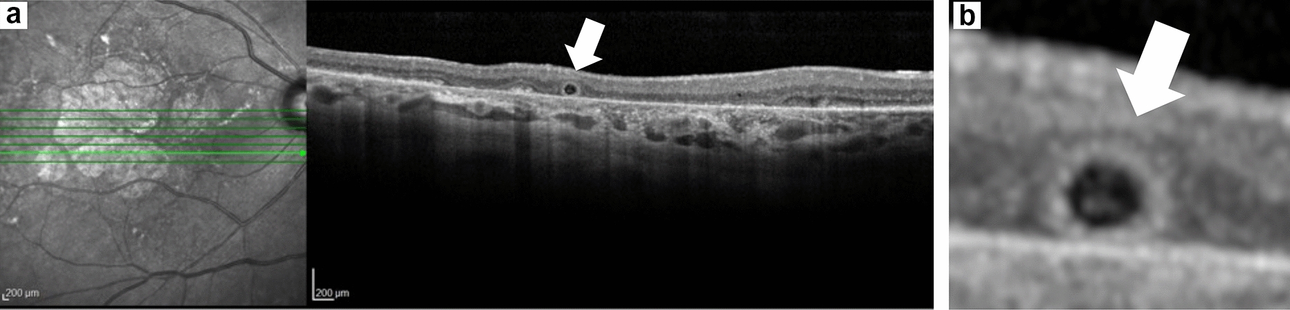 ORT (white arrow) on cross sectional OCT (Spectralis, Heidelberg Engineering, Heidelberg, Germany) of a sham eye in the OAKS and DERBY trials (a) and magnified view of the region with ORT (b). Round hyporeflective core completely surrounded by a hyperreflective border and located in the region of GA. Note the choroidal hypertransmission and complete loss of the photoreceptor and RPE layers, consistent with advanced subfoveal GA. GA geographic atrophy, OCT optical coherence tomography, ORT outer retinal tubulation, RPE retinal pigment epithelium