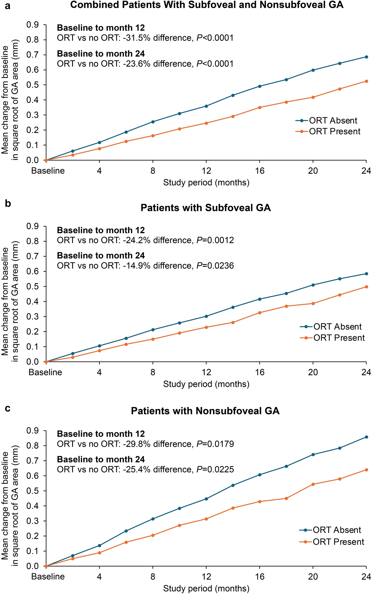 Change in square root of total GA area over time by baseline ORT status in patients with combined subfoveal and nonsubfoveal GA (a), subfoveal GA (b), and nonsubfoveal GA (c)