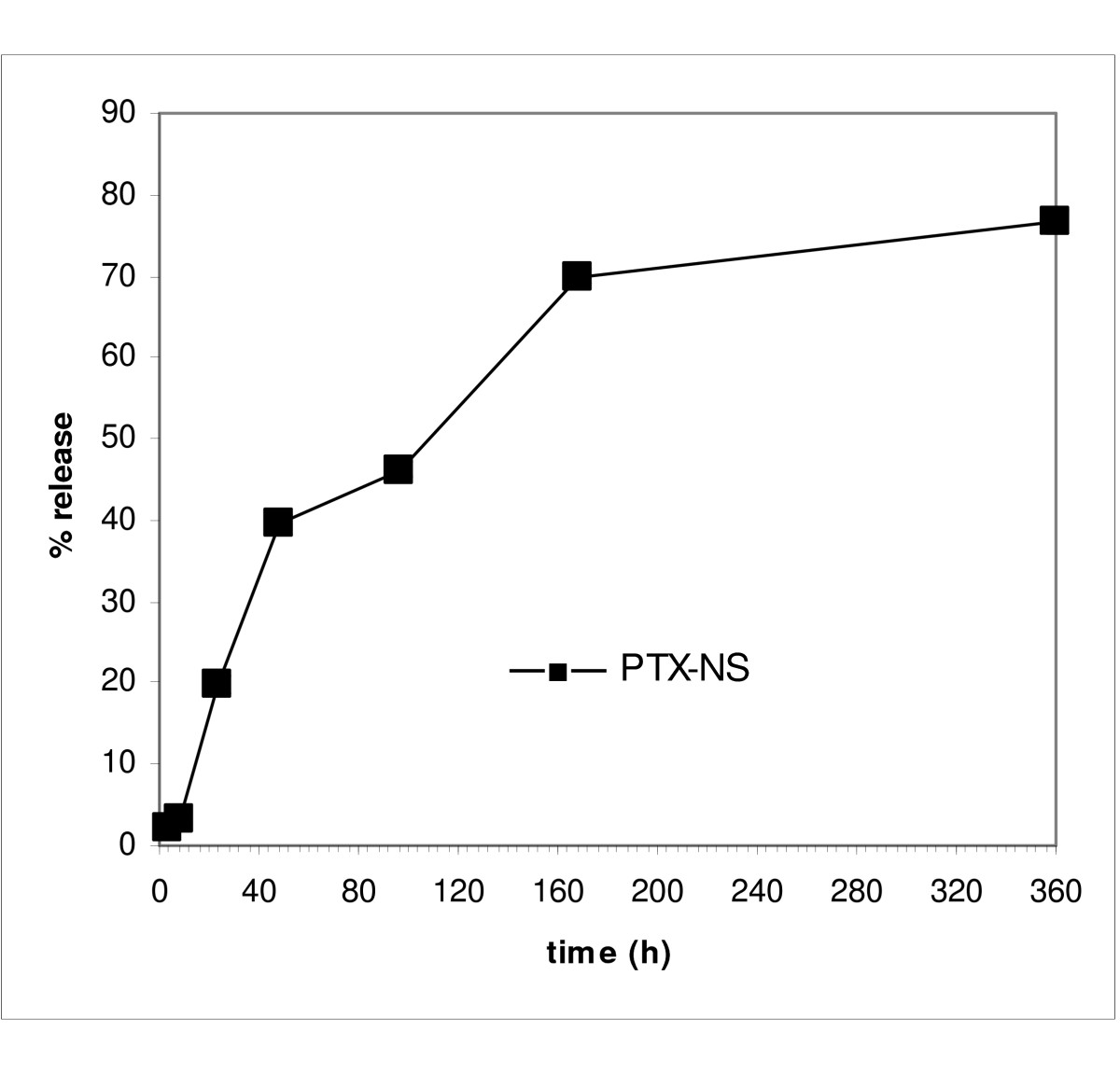 In vitrorelease of PTX-NS. PTX 3% loaded NS in pH 7.4 phosphate buffer solution, at 37°C for 360 h. Data are expressed as the mean ± SD of five separate experiments.