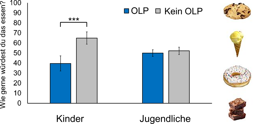 Die Wirkung von OLPs auf den Appetit bei Kindern und Jugendlichen wurde bisher nur in einer Studie untersucht [9]. Dabei betrachteten die Teilnehmenden, die in zwei Altersgruppen unterteilt waren (Jugendliche: 16 bis 18 Jahre und Kinder: 8 bis 12 Jahre) Bilder mit unterschiedlichen Nahrungsmitteln, u. a. Süßigkeiten wie Eis und Schokolade. Nach jedem Bild wurden sie gefragt, wie gerne sie das betrachtete Nahrungsmittel essen würden. Als offenes Placebo diente ein Pumpspray mit blau eingefärbtem Wasser zur oralen Einnahme. Auf der Sprühflasche fand sich ein Etikett mit der Aufschrift „Placebo – für weniger Appetit“. Die Teilnehmenden wurden per Zufall einer von zwei Gruppen zugeteilt, die vor der Bildbetrachtung das OLP (drei Pumpstöße) oder kein OLP erhielten. Außerdem wurde eine kurze Information zu Placebos und deren Wirkung gegeben mit Darstellung wissenschaftlicher Befunde. Es zeigte sich, dass das OLP bei Kindern effektiv den berichteten Appetit reduzierte (Abb. 1), während dieser Effekt bei Jugendlichen ausblieb. Letztere äußerten sich skeptisch gegenüber dem Konzept offener Placebos und gaben an, deren Wirksamkeit setze ihrer Ansicht nach Täuschung voraus.