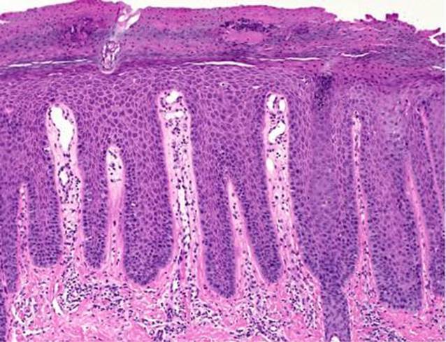 Palmoplantare Erytheme, Schuppen mit teilweise Bläschen oder Rhagaden | |