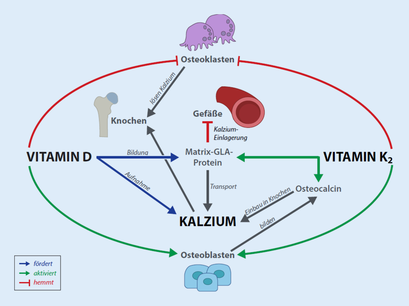Erste Hinweise auf einen Synergismus beider Vitamine ergaben Studien, bei denen die kombinierte Supplementierung von Vitamin K2 mit Vitamin D die Knochendichte bei postmenopausalen Frauen stärker erhöhte als die Gabe von Vitamin K2 allein [34]. Der pathophysiologische Mechanismus ist sehr wahrscheinlich durch vermehrte Carboxylierung des Osteocalcins durch Vitamin K2 erklärbar. Dadurch wird Kalzium vermehrt in den Knochen eingebaut und gleichzeitig durch die Carboxylierung des Matrix-GLA-Proteins aus den Gefäßen wegtransportiert. Eine weitere, indirekte Rolle von Vitamin D in diesem Prozess ist die Stimulation der Aufnahme von Kalzium aus dem Darm.
