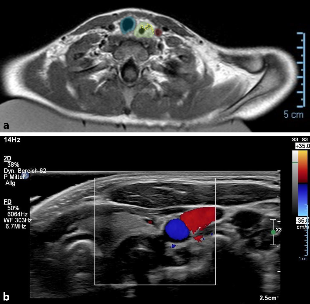 a MRT präoperativ. Trachea (blau), ödematöser Ösophagus (grün) mit 2 gangbildenden Ulzerationen (gelb), von denen einer bis in die Nähe der ACC (rot) reicht. b Farbkodierte Duplexsonographie: Ösophaguswand ohne erkennbare trennende Strukturen zur ACC (Farbduplex, blau)