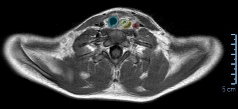 Postoperatives MRT. Trachea (blau), Ösophagus (grün) deutlich weniger wandverdickt, zwischen Ösophagus und ACC (rot) das Kollagenflies (gelb)