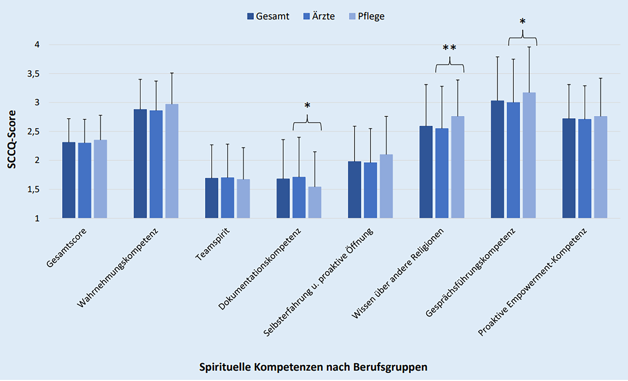 14]. Die MW der 7 Kompetenzen lassen sich auch mit der Validierungskohorte des SCCQ mit 714 Teilnehmer:innen unterschiedlicher Professionen vergleichen. Hier wurde ebenfalls die Dokumentationskompetenz am schlechtesten, die Gesprächsführungskompetenz am besten bewertet. Die Zusammensetzung der Stichproben aller 3 Studien ist allerdings sehr unterschiedlich. Während in der Validierungskohorte 74 % Frauen und in der psychiatrischen bzw. psychotherapeutischen Erhebung 73 % Frauen waren, waren in unserer Studie nur rund 55 % weiblich. Auch unterschieden sich Alter, Professionen und Fachbereiche zwischen den Kohorten. Als Einfluss auf spirituelle Kompetenzen zeigte das Alter positive Korrelationen sowohl in der Validierungsstudie als auch in der Erhebung bei psychiatrischem und psychotherapeutischem Personal, die in der Validierungsstudie als individuelle Entwicklungsprozesse gewertet wurden [