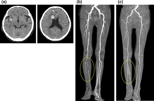 a Bilateral multifocal cerebral hematoma on plain cranial CT. b Arterial sclerotic lesion in the patient’s right leg. c Restoration of blood flow in the tibial and peroneal arteries