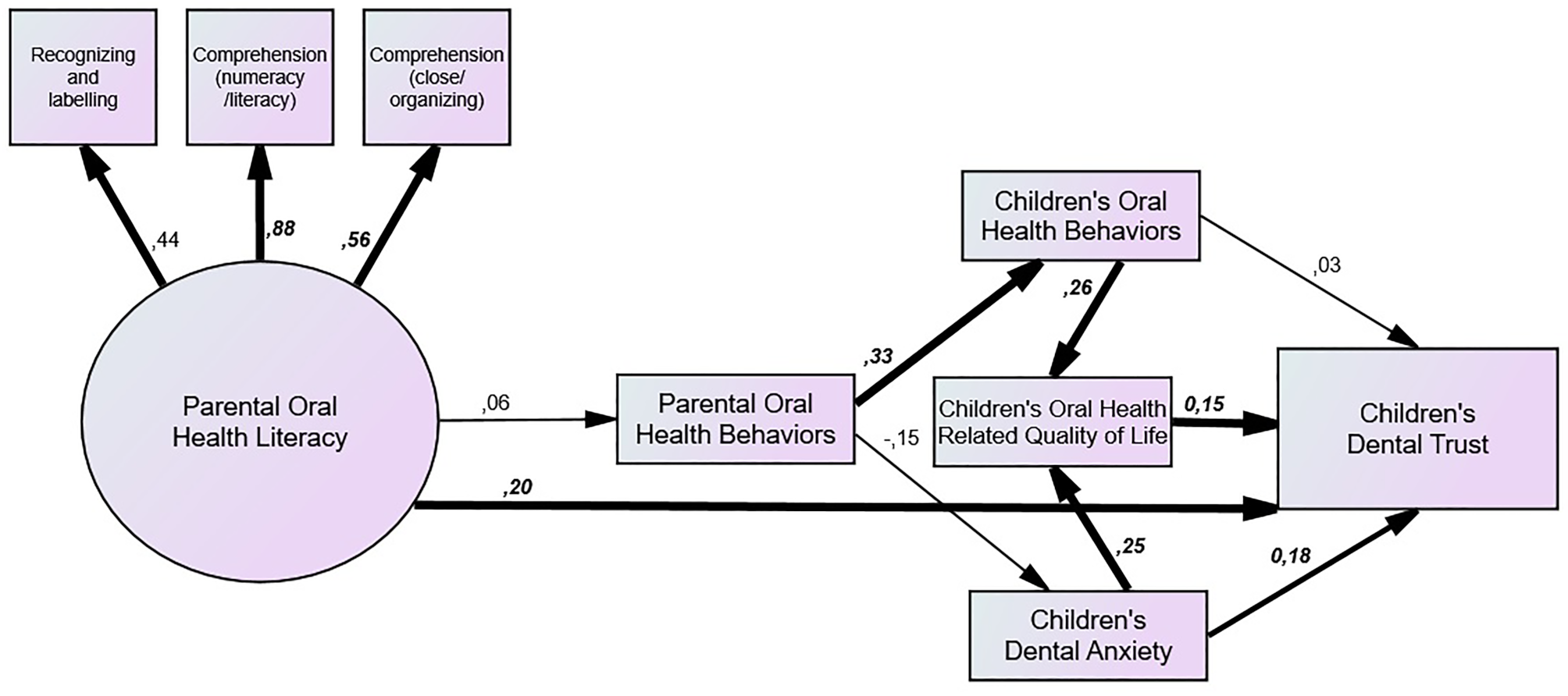Based on the model findings, future interventions could focus on enhancing parental oral health literacy and addressing dental anxiety through targeted educational programs and anxiety-reducing strategies. Such interventions could foster greater trust in pediatric dental settings, ultimately promoting more positive oral health outcomes in children. This approach bridges our findings with actionable strategies, providing practical applications for improving pediatric dental care.