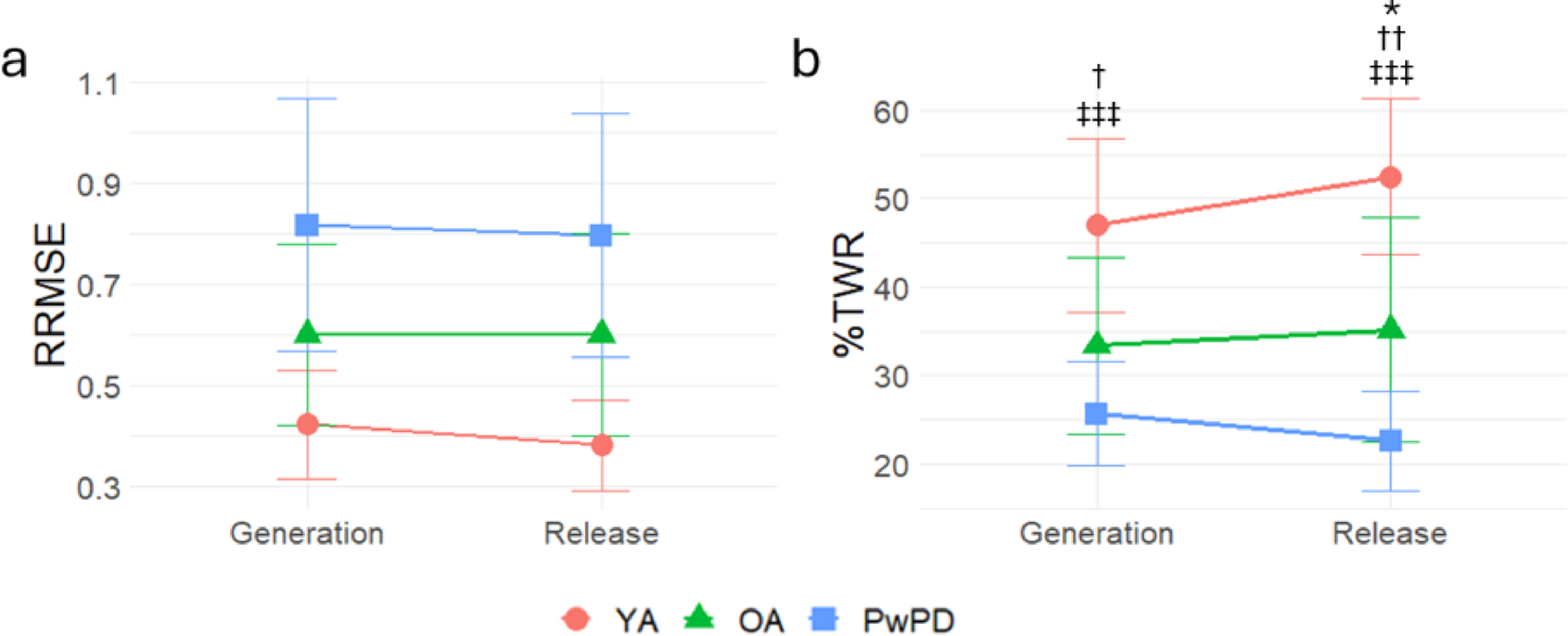 Line plots of generation and release phase A relative root mean squared error (RRMSE), where higher values indicate greater error, and B percent time within target range (%TWR), where higher values indicate greater accuracy. Note that the %TWR interaction is driven by the release phase. The PD group exhibited the greatest error and worst accuracy of the three groups. Error bars represent standard deviation. * OA versus PwPD, † YA versus OA, ‡ YA versus PwPD; * p <.05, ** p < .01, *** p < .001