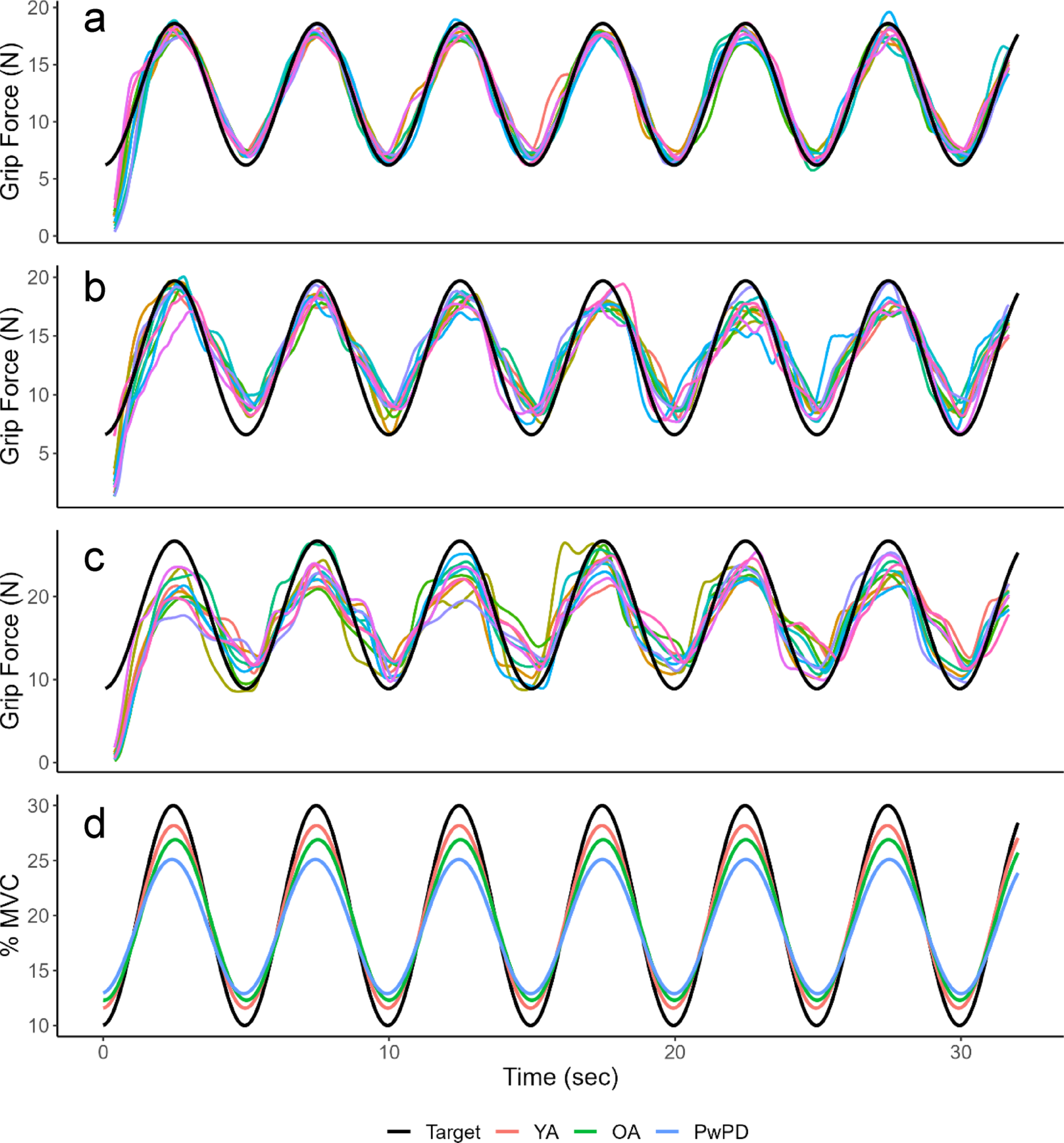 Representative trials from A a YA, B an OA, and C a PwPD. The black line indicates the target force, the upper and lower bounds of which were fixed at 10–30% of the participant’s maximum voluntary contraction (MVC). The colored lines represent the participant’s actual force (20-sample rolling avg) for all 10 trials. Progressive decline in amplitude and performance is seen with healthy aging and PD. D Representative sine wave traces based on mean least square fit values for each group, with the black line indicating normalized target force. Note the clear group differences in amplitude