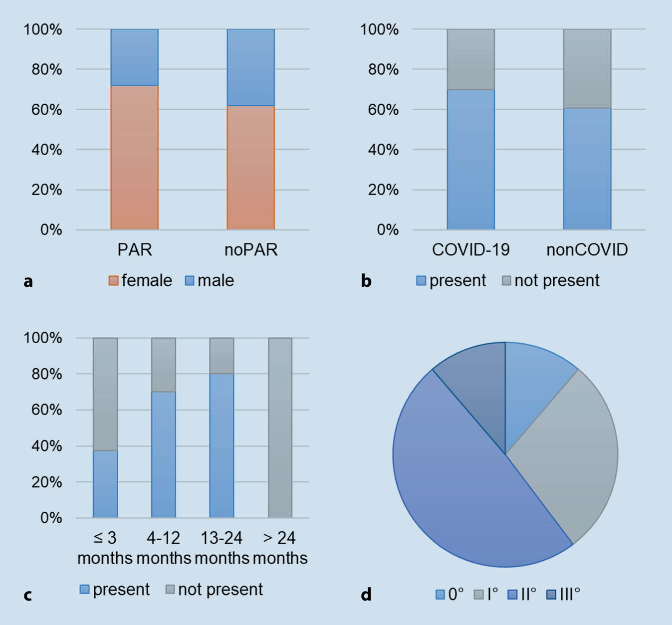 a Gender ratio in the groups with parosmia present and not present. b Proportion of parosmia in the COVID-19 and non-COVID groups. c Ratio of duration of disease in the groups with parosmia present and not present subdivided into ≤ 3 months, 4–12 months, 13–24 months, and > 24 months. d Distribution of parosmia degree in the study population
