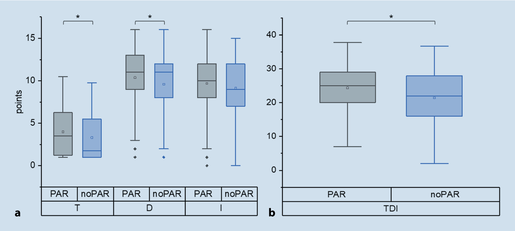Box plot of odor threshold (T), discrimination (D), identification (I), and TDI scores (TDI) in patients with parosmia (PAR) and without (noPAR). *Statistically significant differences between the groups; □ median value, ♦ outliers