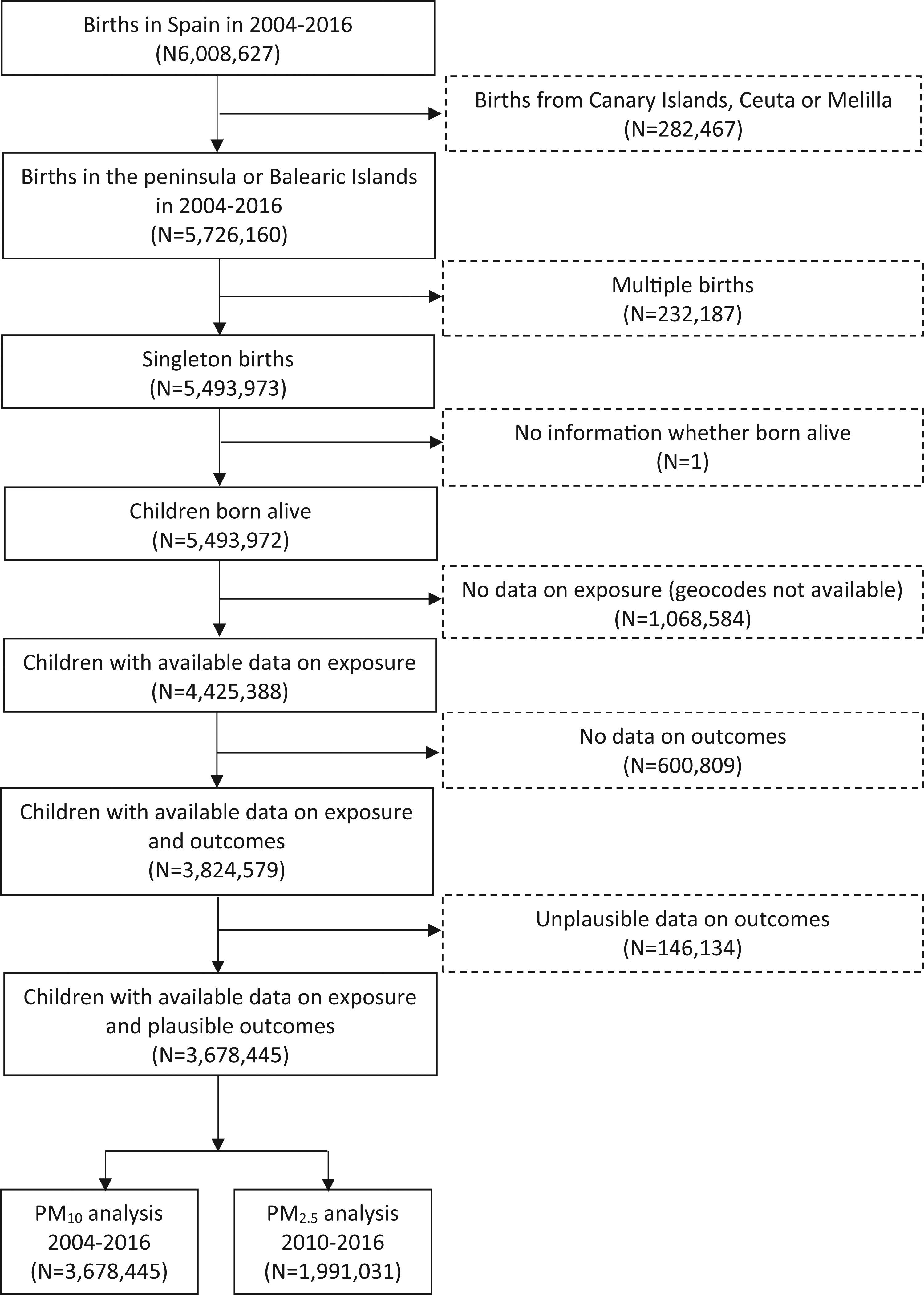 We established a nationwide, population-based cohort using the Spanish Birth Registry Statistics database of the National Statistics Institute. The initial population comprised singleton live births recorded across Spain (excluding Canary Islands, Ceuta, and Melilla) between January 2004 and December 2016 (N = 5,493,972) (Fig. 1). We excluded births with missing information on air pollution exposure (due to unavailable maternal address at delivery), birthweight, gestational age, and implausible values for birthweight or gestational age. This resulted in a final sample of 3,678,445 birth records (67% of the initial population). We only had data on PM2.5 between 2009 and 2016, thus the final sample involving PM2.5 included 1,991,031 births from January 2010 to December 2016.