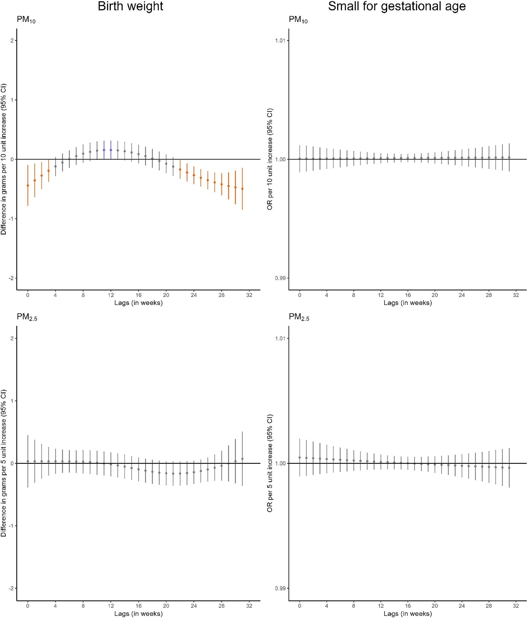 Adjusted lag-response association of weekly-average particle matter concentrations during pregnancy with birthweight and small for gestational age. CI confidence interval, OR odds ratio, PM10 particular matter with aerodynamic diameter less than 10 μm, PM2.5 particular matter with aerodynamic diameter less than 2.5 μm. Adjusted for parental age, parental educational level, parental social class based on occupation, maternal nationality, maternal civil status, parity, area-level deprivation index, urbanicity, month and year of conception, weekly temperature across pregnancy, and geographical region. Dots represent the effect estimates of the association between the exposure at each specific lag and the outcome. Vertical gray, blue, and orange lines represent 95% CI and indicate no divergence from the null, significant divergence from positive association, and significant divergence from negative association, respectively. All associations survived correction for multiple testing (p-value ≤ 0.05)