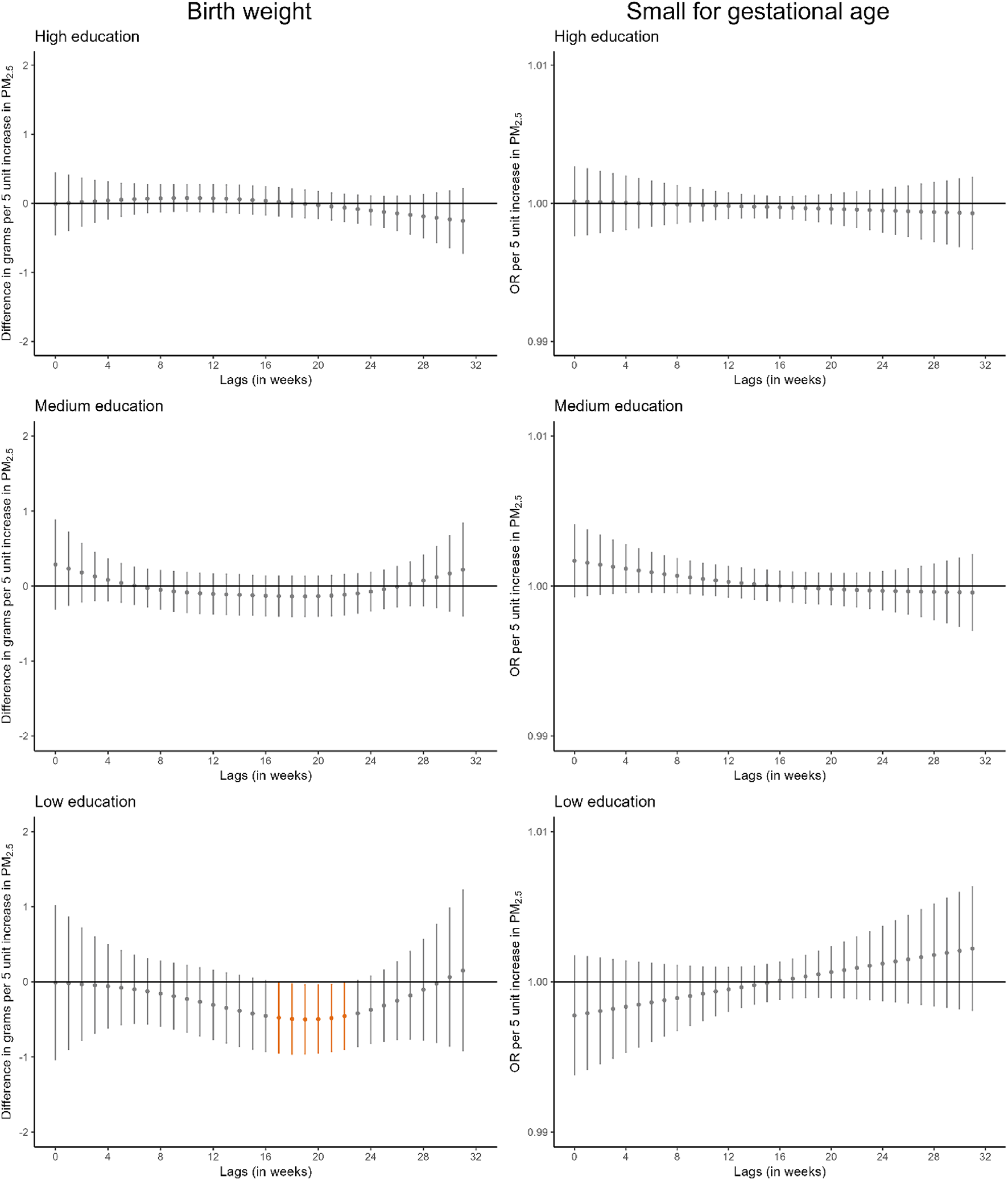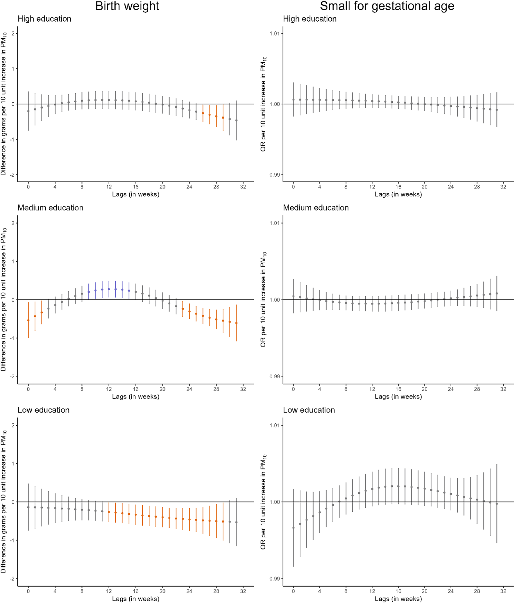 Adjusted lag-response association of weekly-average PM10 and PM2.5 concentrations during pregnancy with birthweight and small for gestational age according to maternal educational level. CI, confidence interval; OR, odds ratio; PM10, particular matter with aerodynamic diameter less than 10 μm; PM2.5, particular matter with aerodynamic diameter less than 2.5 μm. Adjusted for parental age, paternal educational level, parental social class based on occupation, maternal nationality, maternal civil status, parity, area-level deprivation index, urbanicity, month and year of conception, weekly temperature across pregnancy, and geographical region. Dots represent the effect estimates of the association between the exposure at each specific lag and the outcome. Vertical gray, blue, and orange lines represent 95% CI and indicate no divergence from the null, significant divergence from positive association, and significant divergence from negative association, respectively. All associations survived correction for multiple testing (p-value ≤ 0.05)