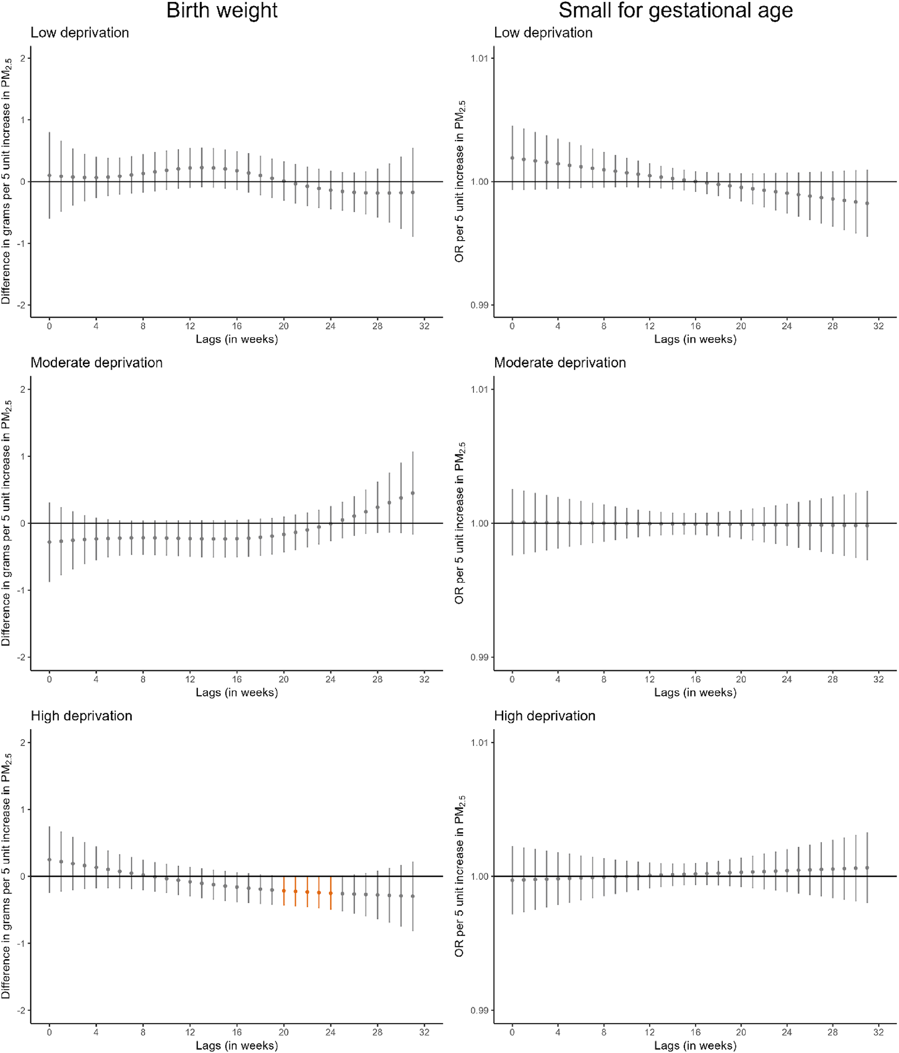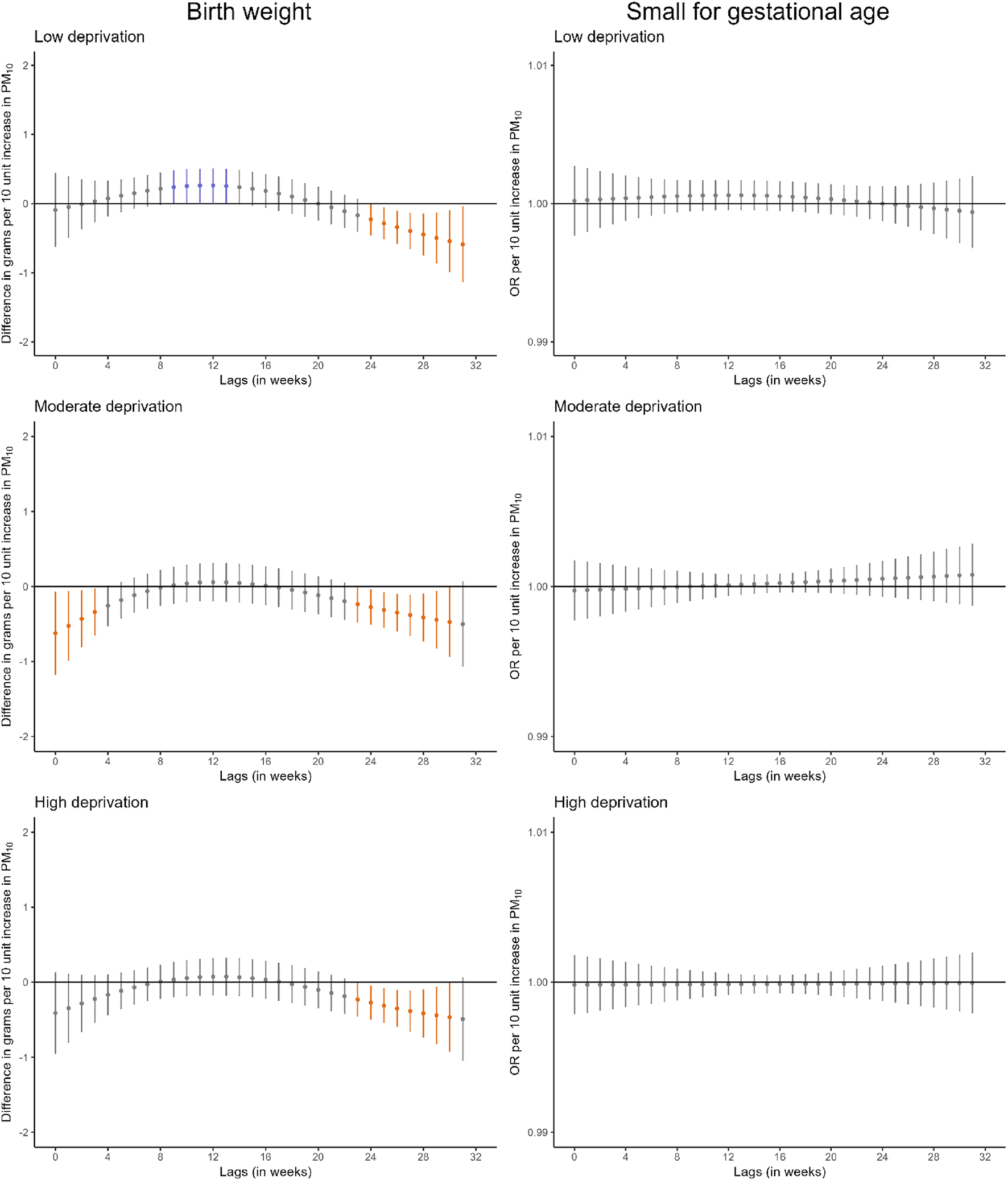 Adjusted lag-response association of weekly-average PM10 and PM2.5 concentrations during pregnancy with birthweight and small for gestational age according to area-level deprivation index. CI, confidence interval; OR, odds ratio; PM10, particular matter with aerodynamic diameter less than 10 μm; PM2.5, particular matter with aerodynamic diameter less than 2.5 μm. Adjusted for parental age, parental educational level, parental social class based on occupation, maternal nationality, maternal civil status, parity, urbanicity, month and year of conception, weekly temperature across pregnancy, and geographical region. Dots represent the effect estimates of the association between the exposure at each specific lag and the outcome. Vertical gray, blue, and orange lines represent 95% CI and indicate no divergence from the null, significant divergence from positive association, and significant divergence from negative association, respectively. All associations survived correction for multiple testing (p-value ≤ 0.05)