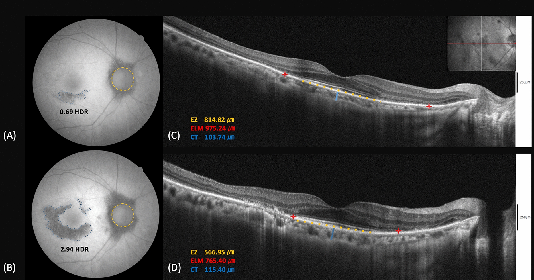 An increase of the areas of the hypoautofluorecence in the fundus autofluorescence between the initial scan (A) and the follow-up scan at 2.5 years after hydroxychloroquine cessation (B). The hypoautofluorescent area, which was associated with RPE loss in hydroxychloroquine retinopathy, was measured and then divided by the disc area to obtain the hypoautofluoresecent area-to-disc-area ratio (HDR). In this case, there was an increase in hypoautofluorescent area, from 0.69 to 2.94 HDR, and the progression rate was + 0.90 HDR/year. Length of the ellipsoid zone (EZ)/ external limiting membrane (ELM) and choroidal thickness (CT) between the initial scan (C) and the follow-up scan at 2.5 years after hydroxychloroquine cessation (D). For cases in which EZ/ELM disruptions were present on both sides of the fovea, the length of the intact central EZ/ELM was measured. Choroidal thickness was measured from the hyperreflective line to the hyporeflective line, corresponding to the retinal pigment epithelium to the scleral–choroidal interface, beneath the foveal pit region. In this case, the mean lengths of EZ/ELM/CT change were from 814.82 to 566.95 μm, 975.24 to 765.40 μm, and 103.74 to 115.40 μm, respectively. The progression rate of EZ/ELM/EZ/choroid thickness of OCT was − 99.15, − 83.94, and + 4.66 μm/year, respectively