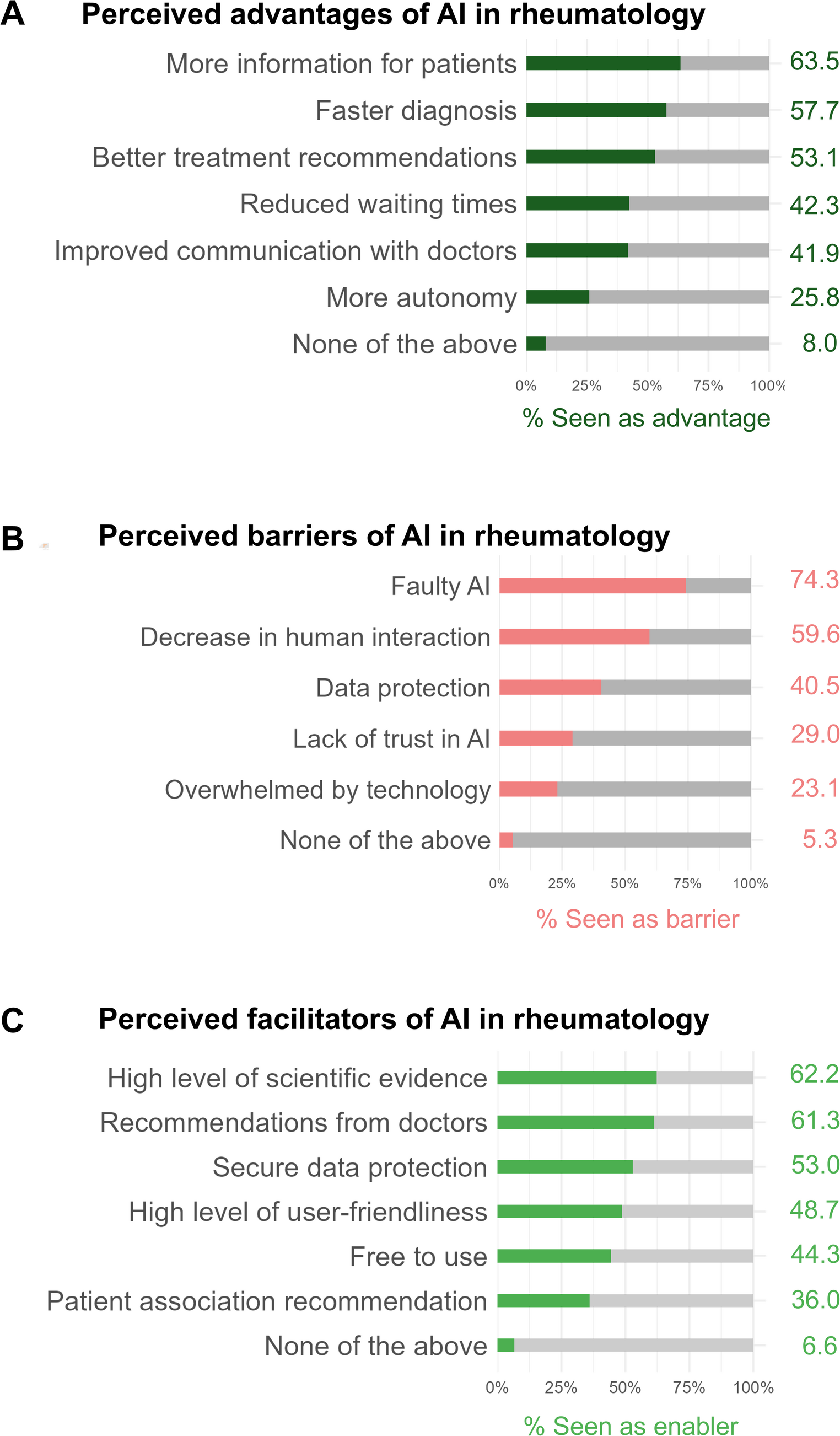 24]. Addressing these issues through transparent information, patient involvement in AI development, and clinician–patient dialogue will be crucial for fostering trust and acceptance. Scientific validation, physician endorsement, secure data protection and user-friendliness were key factors influencing acceptance, underscoring the important role of clinicians and academic institutions in guiding responsible AI integration. The finding that over one-third of patients regarded recommendations from patient organizations as a facilitator shows the critical role of such organizations when implementing AI in rheumatology.