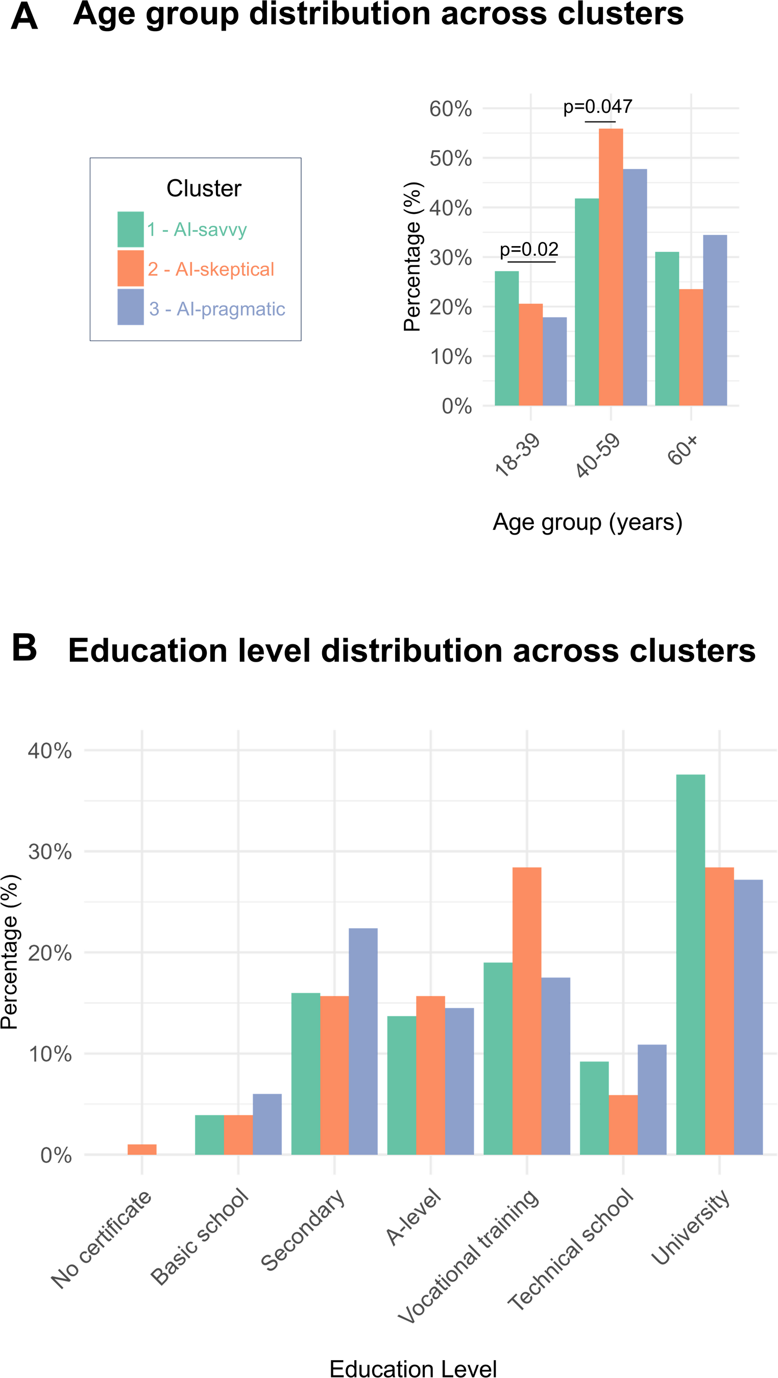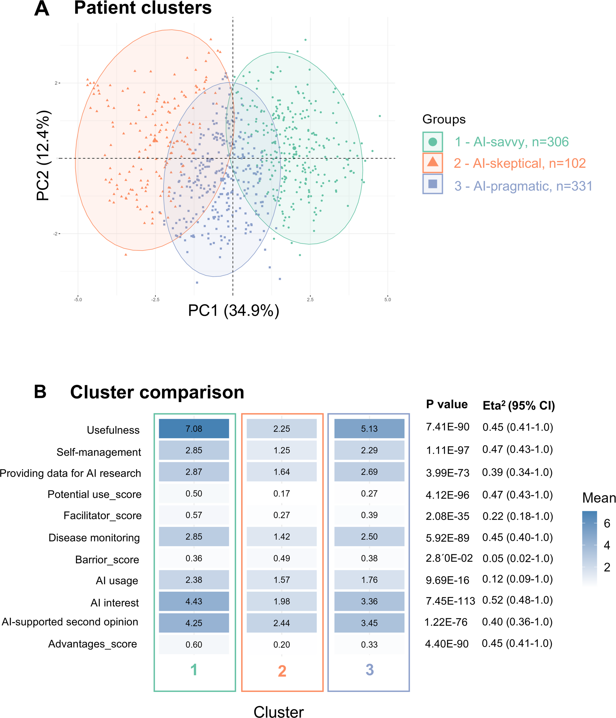10]. Differences between clusters were assessed using one-way ANOVA followed by Tukey’s HSD post hoc tests. Associations between cluster membership and demographic or clinical variables were examined using Fisher’s exact tests (pairwise, where appropriate). In addition to p-values, effect sizes were calculated to quantify the magnitude of observed differences. Eta squared (η²) was reported for continuous outcomes such as AI interest, perceived usefulness, and AI usage. Effect sizes (η²) were interpreted as small (≈ 0.01), medium (≈ 0.06), and large (≈ 0.14). Cramér’s V was used to measure the strength of association between categorical variables (e.g., sex, age group, education, healthcare setting, and disease) and cluster membership. All analyses and figures were generated in R (version 4.5.0; RStudio 2025.05.0) using the packages FactoMineR, ggplot2, and cluster. Figures were generated in R using