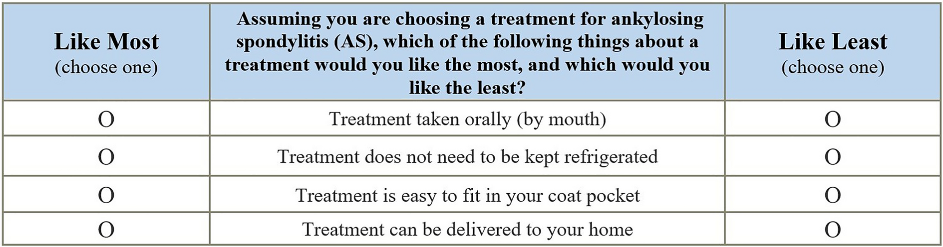 This mixed-methods study tested preferences for AT treatment administration attributes among patients with AS based on AT experience and disease status. |