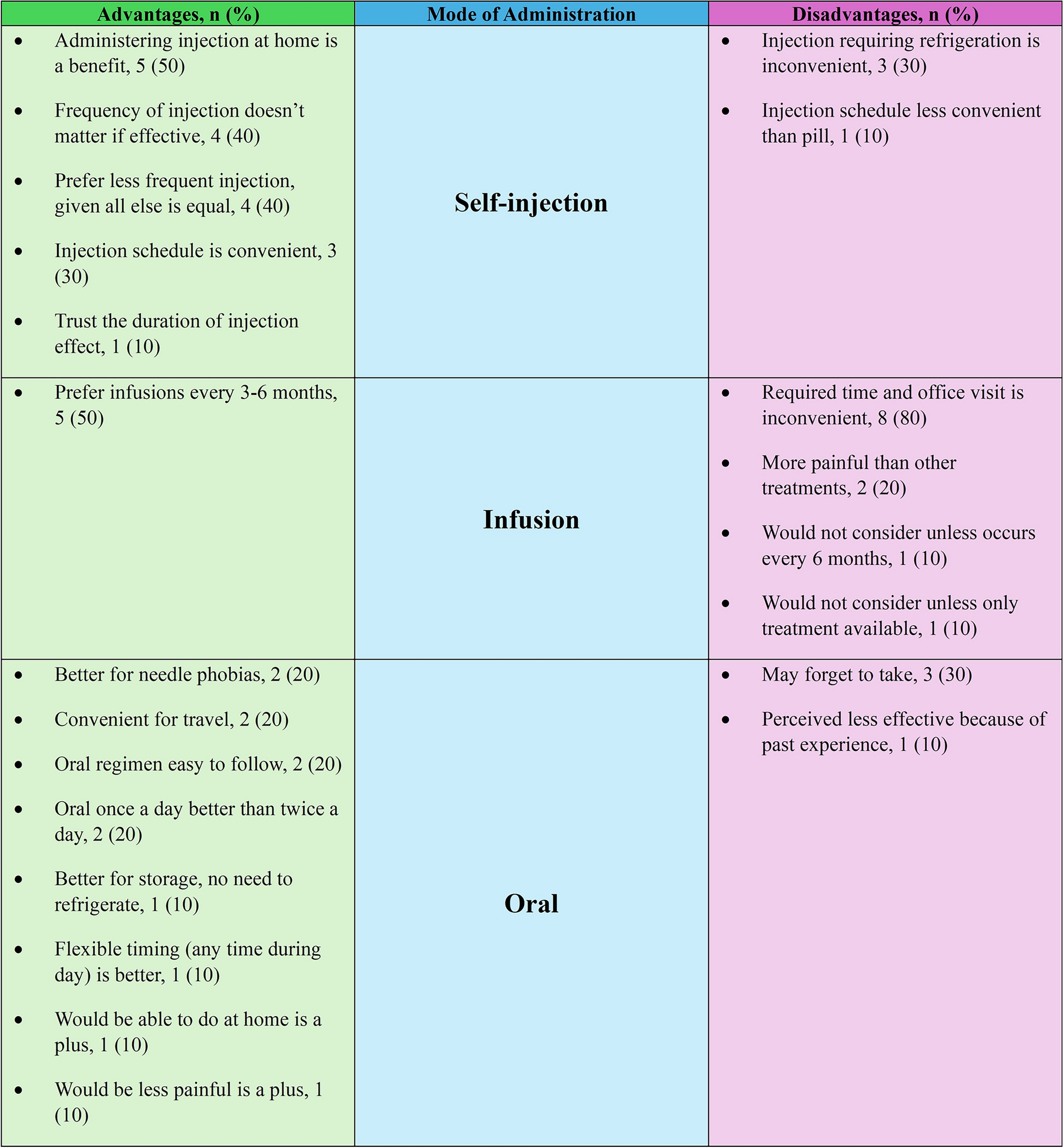 Overall, patients generally prefer oral over self-injection options, less frequent administration, and avoiding the need for doctor visits to receive treatment. |