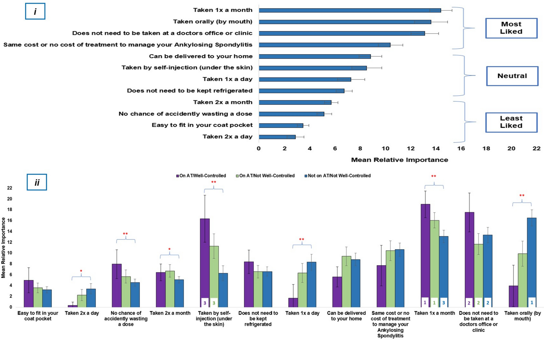 Patients with AS who are AT naïve and do not have well-controlled disease have a strong preference for oral treatments, suggesting that injections may be a barrier to initiating AT, whereas for patients with AT experience, avoiding injections is less of a priority than reducing injection frequency. |