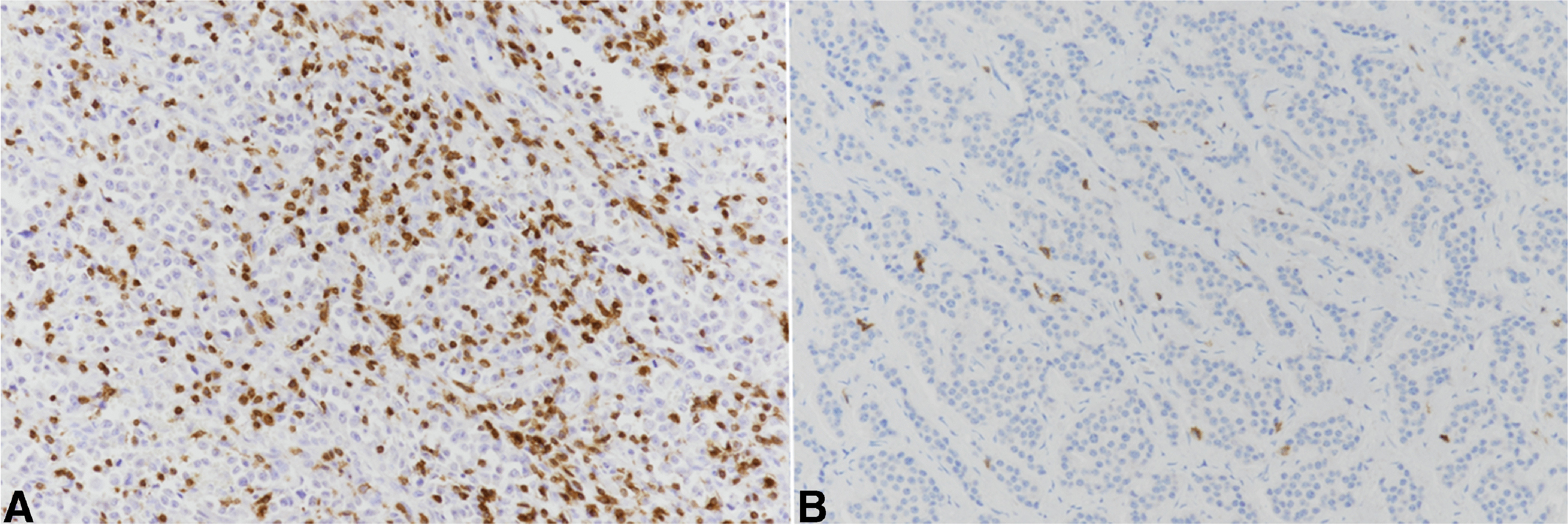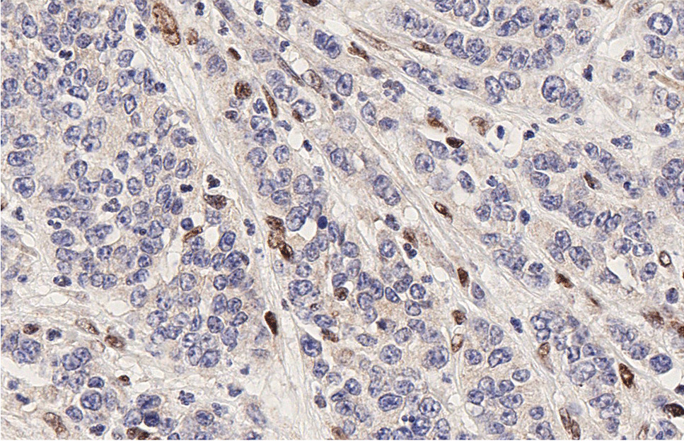 All tissues were fixed in buffered formalin and embedded in paraffin wax. 5 µm-thick sections were obtained from representative tumor blocks and were stained with hematoxylin–eosin (H&E) for the histopathological examination, which included the evaluation of morphological differentiation, mitotic count, presence of vascular, lymphatic and perineural invasion, and presence of necrosis. Immunohistochemistry (IHC) was performed on a Ventana Benchmark XT autostainer (Ventana Medical System, Tucson, AZ, USA) following the manufacturers’ guidelines and using the following antibodies: PD-L1 (monoclonal, clone SP263, Ventana), CD3 (monoclonal, 2GV6, Ventana), CD4 (monoclonal, clone SP35, Ventana), CD8 (monoclonal, clone C8/144B, Dako, Carpinteira, Denmark), hMLH1 (monoclonal, clone M1, Ventana), hMSH2 (monoclonal, clone G219-1129, Ventana), hMSH6 (monoclonal, clone 44, Ventana), hPMS2 (monoclonal, clone EPR3947, Ventana). Immunohistochemical stains for neuroendocrine markers (synaptophysin and chromogranin) and Ki67 were already available for all cases. The expression of immunohistochemical markers was evaluated as follows.