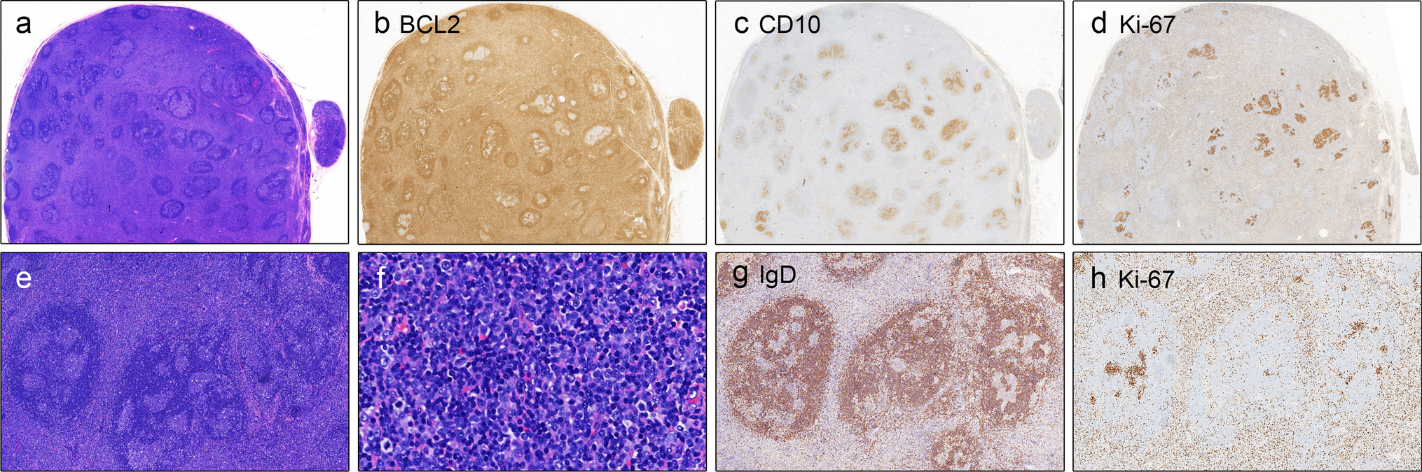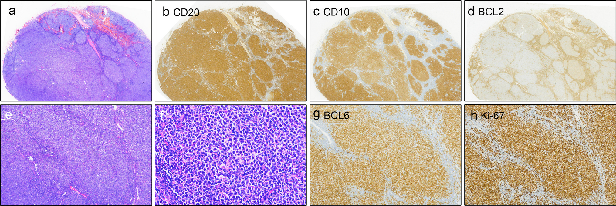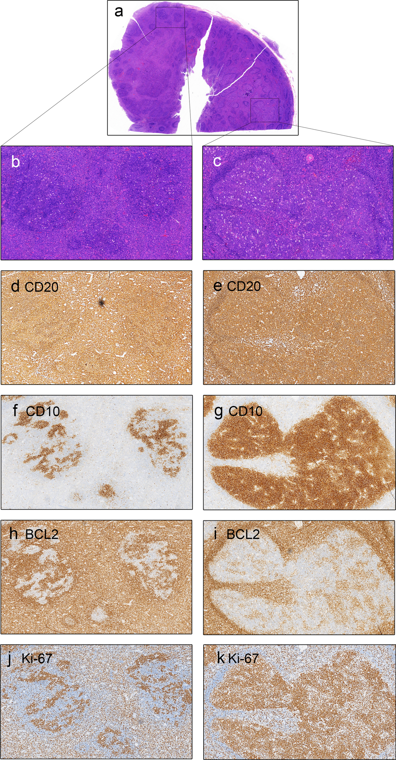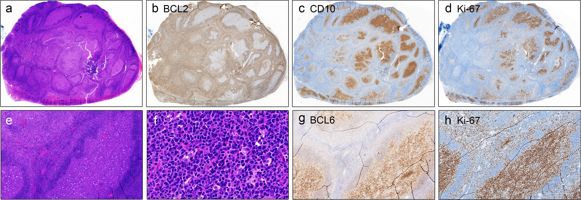 Immunohistochemical staining was performed according to the manufacturers’ protocol. Formalin-fixed paraffin-embedded (FFPE) sections were dewaxed, rehydrated, and stained with primary antibodies against CD20 (clone L26, Roche), CD10 (clone MX002, Maixin), BCL6 (clone LN22, Leica), BCL2 (clone SP66, Roche), MUM1 (clone MUM1P, Maixin), Kappa (multiclonal, Dako), Lambda (multiclonal, Dako), CD43 (clone L260, Roche), and Ki-67 (clone 30-9, Roche) on a BenchMark XT automated immunostainer (Ventana Medical System Inc., Roche Tucson, AZ, USA) according to the EnVision method.