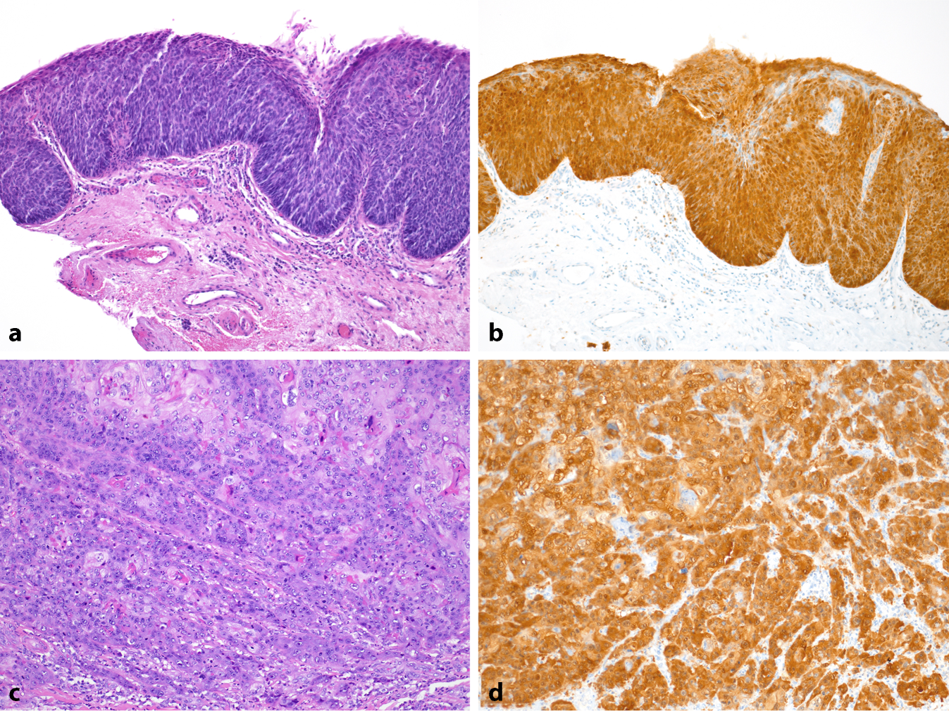 HPV-assoziierte (humane Papillomaviren) Präkanzerose und invasives Peniskarzinom: a HE-Färbung (Hämatoxilin-Eosin) einer HSIL (hochgradige squamöse intraepitheliale Läsion). Es zeigt sich eine die ganze Epitheldicke umfassende dysplastische Proliferation ohne Durchbruch durch die Basalmembran. b p16-Überexpression in allen dysplastischen undifferenzierten basaloiden Zellen der HSIL („block-like staining“). c HE-Färbung eines niedrig differenzierten invasiven Karzinoms. d p16-Überexpression in allen invasiven Zellen des Karzinoms. (Vergrößerung: a,b 10x und c,d 20x)