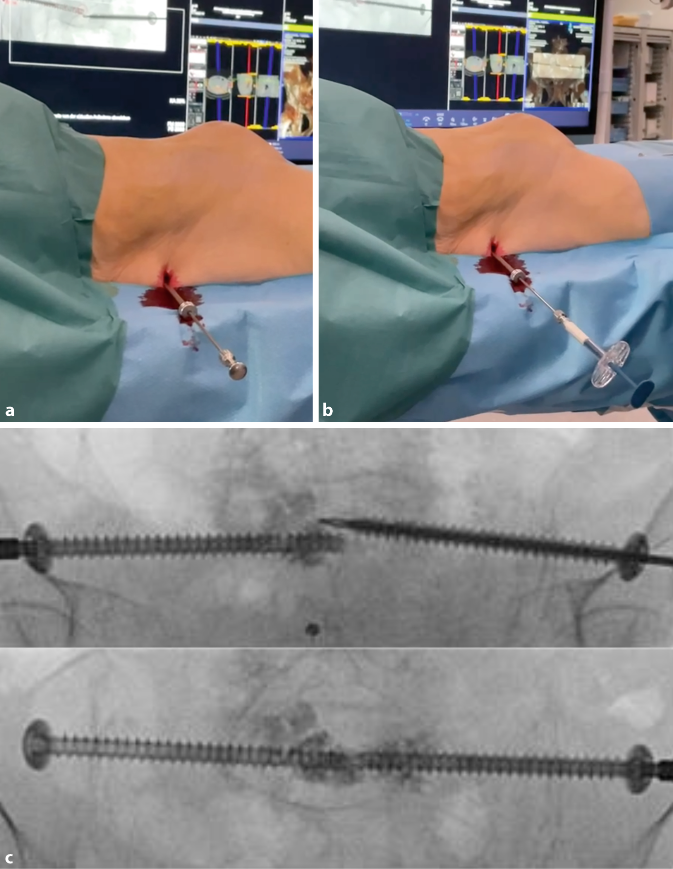 At this stage, a 3D scan can be performed to verify the screws’ correct positioning. In our department, 3D scans are typically conducted at the end of the procedure. For introducing a second screw on the contralateral side, a mirrored version of the original lateral view is used to identify the correct entry point