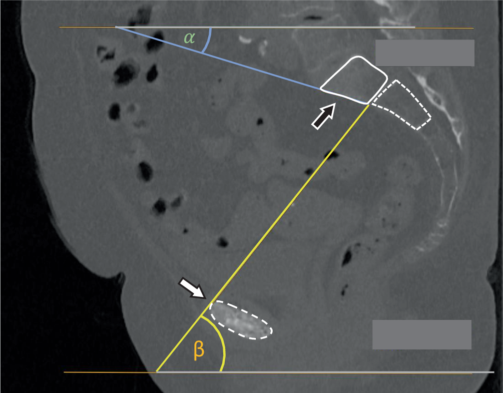 Determination of the personalized inlet angle (α) and personalized outlet angle (β) in the sagittal view. The dashed line encircles the bony part of the symphysis, the solid line encircles the sacral vertebral bodies, the black arrow points to the S1 body