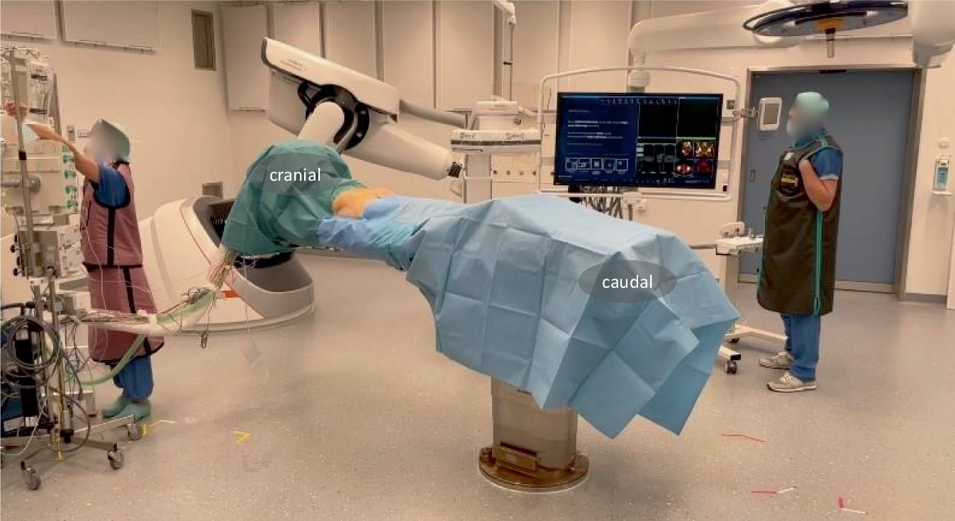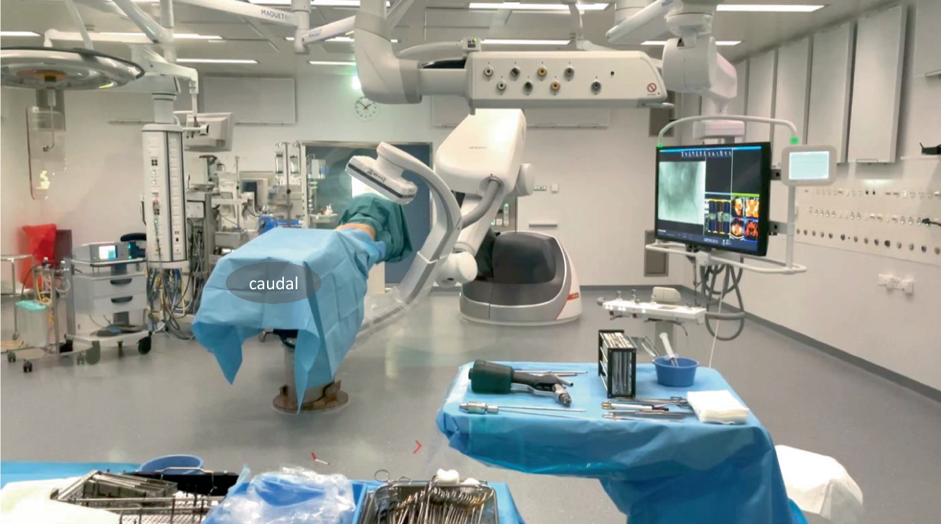 Positioning and draping of the patient. On two movable screens customizable views with intra- and preoperative images may be viewed. The robotic C‑arm is controlled by an operator or the control panel may be draped and operated by the surgeons. For the acquisition of a 3D scan the situs is additionally covered with loose drape