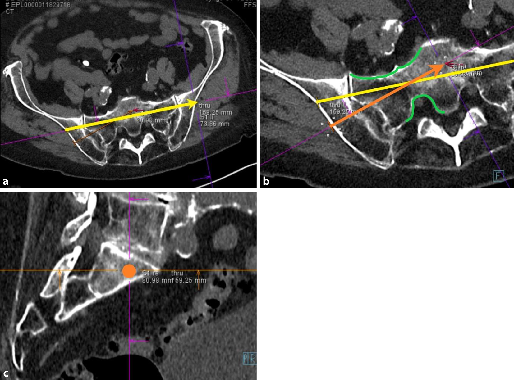 To facilitate an efficient workflow, screw pathway planning on the diagnostic CT is performed while preparing the patient in the hybrid theatre. The process of planning the screw pathways involves several steps. Firstly, ensure symmetrical alignment of the pelvis in all three planes. Then, an auxiliary pathway is defined (yellow arrow,a), to achieve the lateral view intraoperatively (Fig. 5) which is essential to determine the optimal entry point for the SI screw. The predefined personalized inlet, outlet, and lateral views (see appendix2) are saved by the software system to allow swift intraoperative transition between these views. The next step involves planning the desired screws in the coronal and axial slices (orange arrow and dot, b, c). Two critical factors to consider are: ensuring the entry point is not too dorsal to avoid conflict with the operating table due to supine positioning of the patient, and the planned screw ideally transversing the corridor in the S1 body centrally between the ventral sacral cortex and the neuroforamen (green lines, b) [5]. The correct intraosseous path can be checked by scrolling forward and backward along the planned screws in the sagittal plane. These planned screw pathways can be projected with dotted lines on all fluoroscopic views intraoperatively (as shown in Figs. 6, 7, and 9)