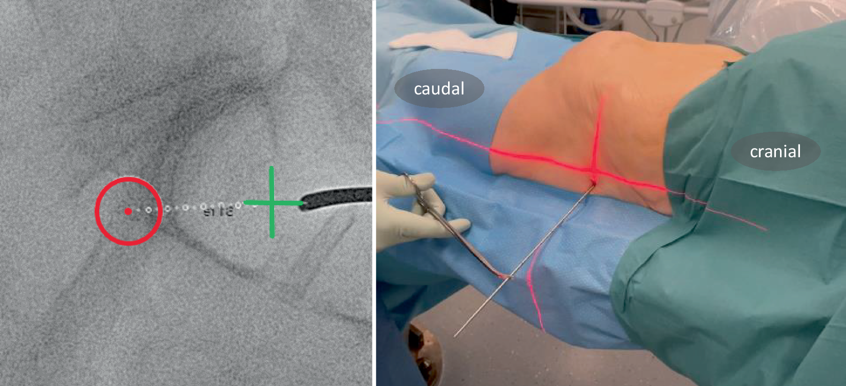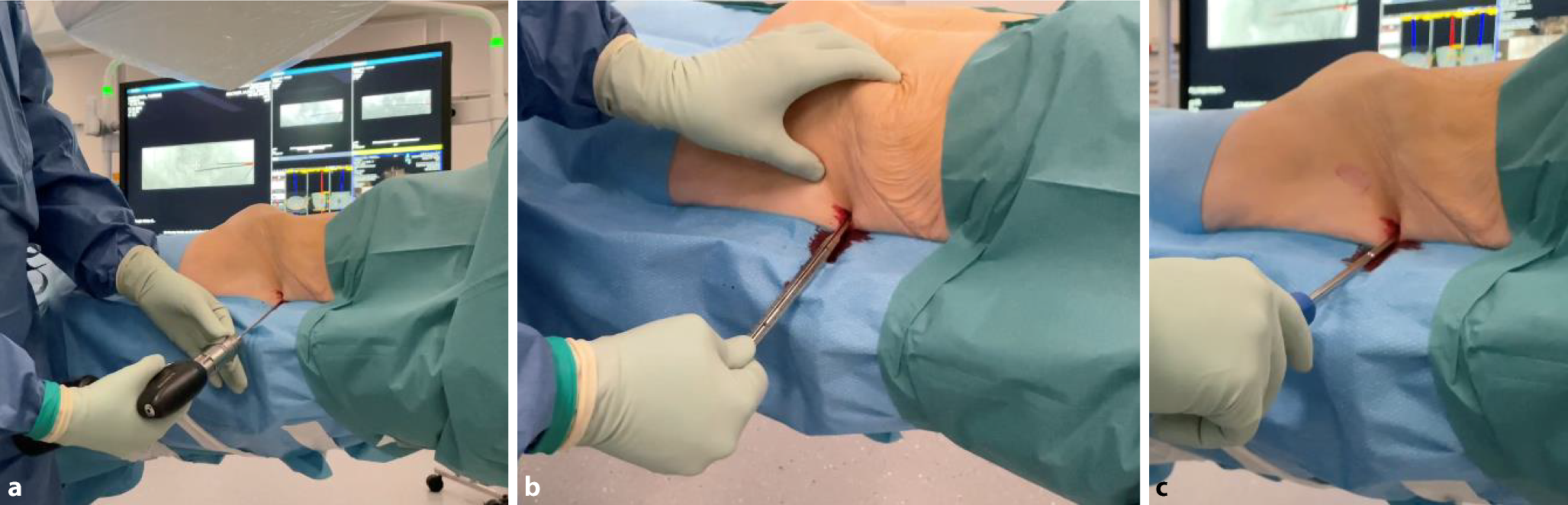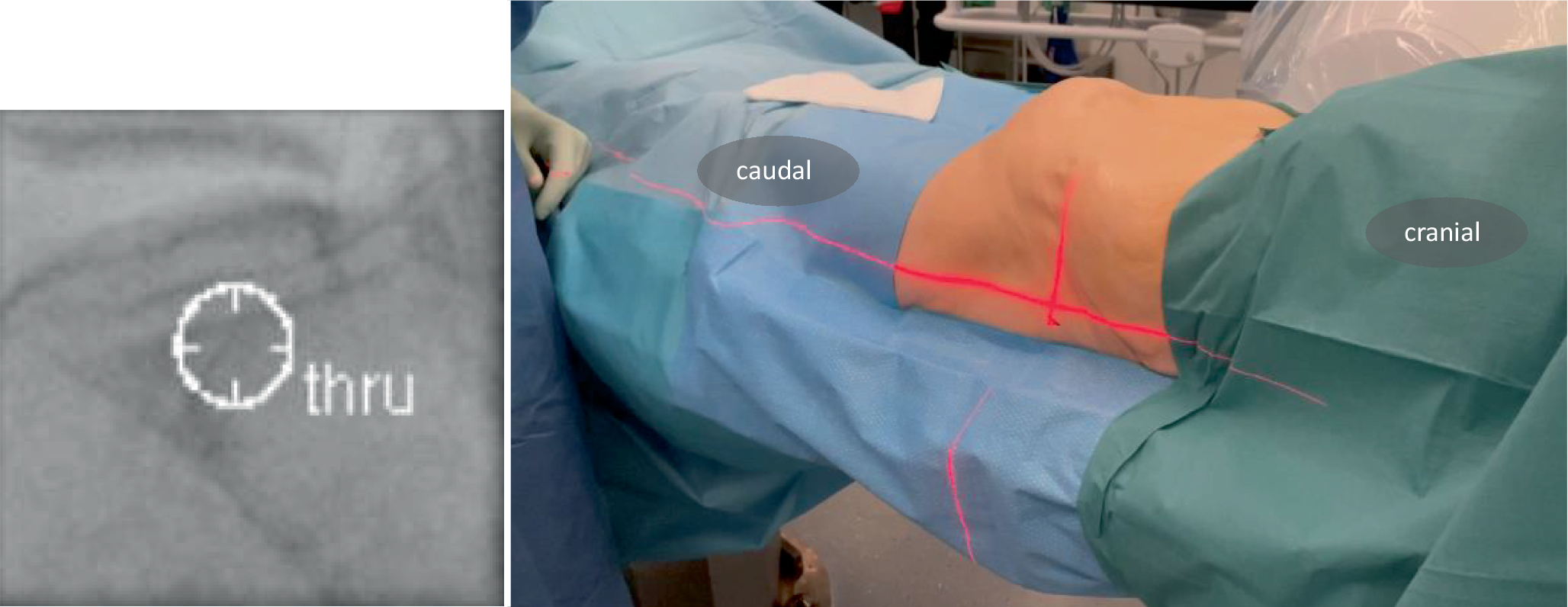 The surgeon stands on the ipsilateral side. Following team time-out, the C‑arm is positioned in the predefined lateral view (yellow arrow, Fig. 4a). The robotic C‑arm software enables approach to a planned screw path in the so-called bull’s eye view, aligning the central X‑ray beam precisely with the screw path. In Fig. 5, this path is displayed in the bull’s eye view as “thru”. To gain more space to work between the patient and the C‑arm, the C‑arm must be moved to the ipsilateral side. Typically, this results in a parallax effect if the patient is not aligned to the table. Manually this may be corrected by moving the C‑arm so the center of the image is aligned with planned entry point. The laser on the patient’s skin indicates the center of the fluoroscopy image. With SI screws typically positioned in a posterior-to-anterior direction (approximately 10–20°), the entry point is more dorsal, requiring a skin incision made 1–2 cm dorsal to the laser marker